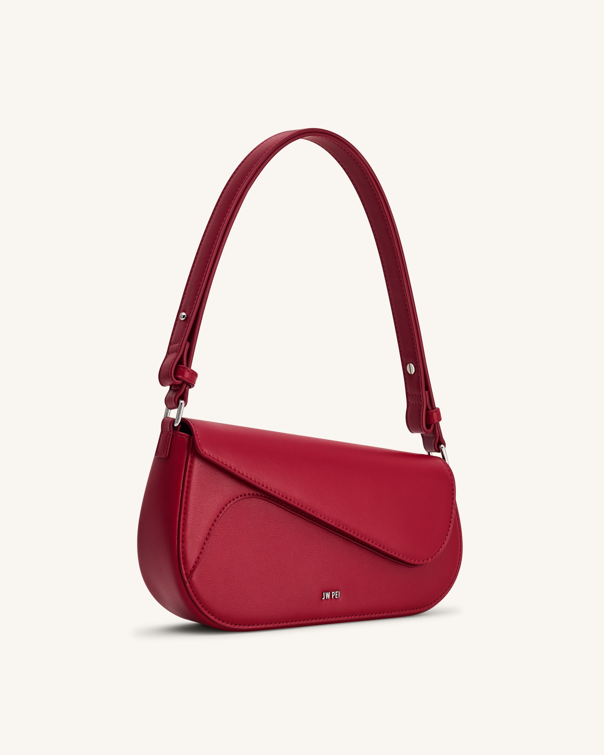 ミニマルなシルエットが際立つ、鮮やかなレッドのヴィーガンレザーバッグ。調節可能なシングルショルダーストラップで自由な持ち方が可能。シルバーの金具が大胆なカラーを引き立てます。昼夜問わず幅広いシーンで活躍する一品です。