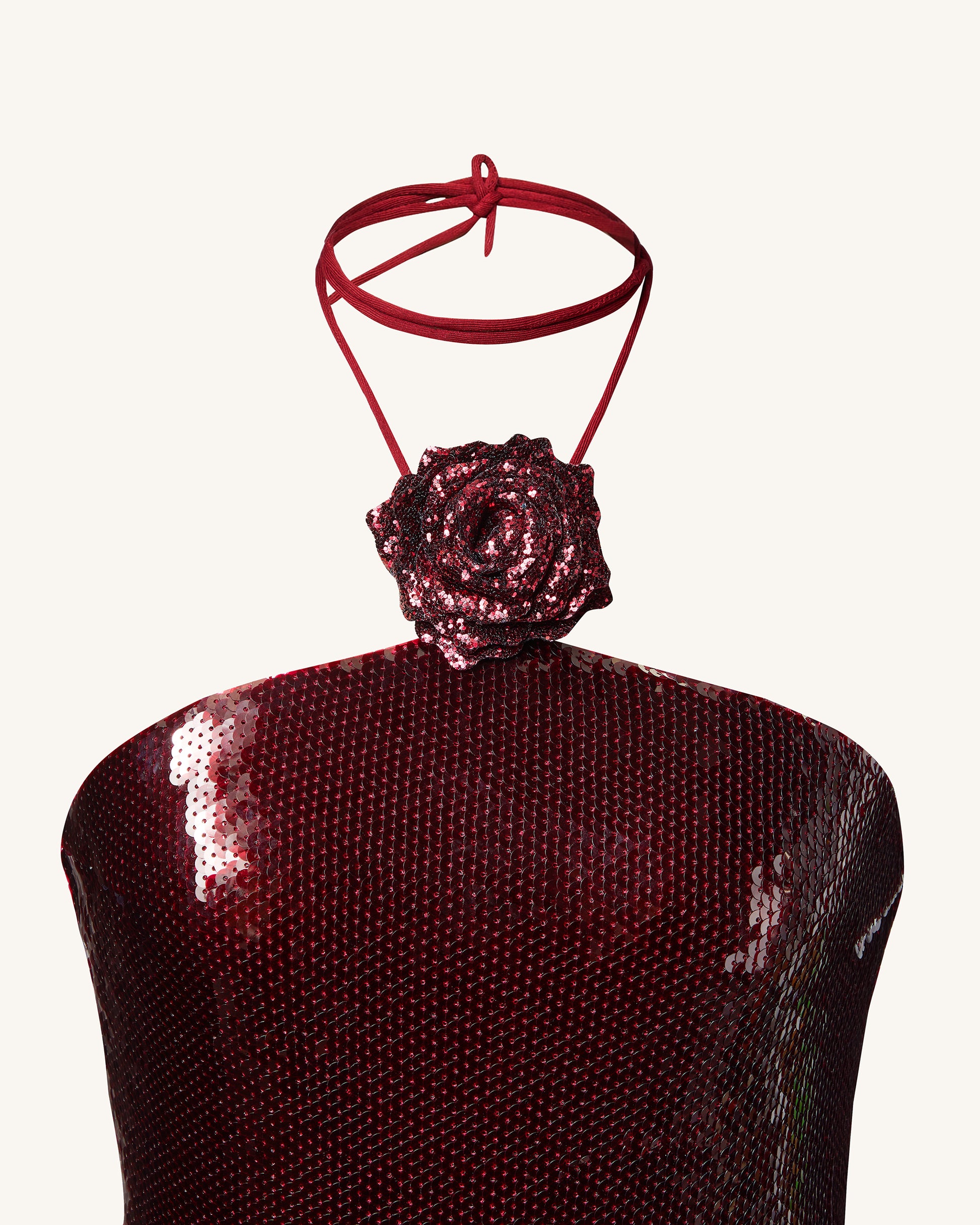 Burgundy ビーズ付きハルターミニドレス - バーガンディ