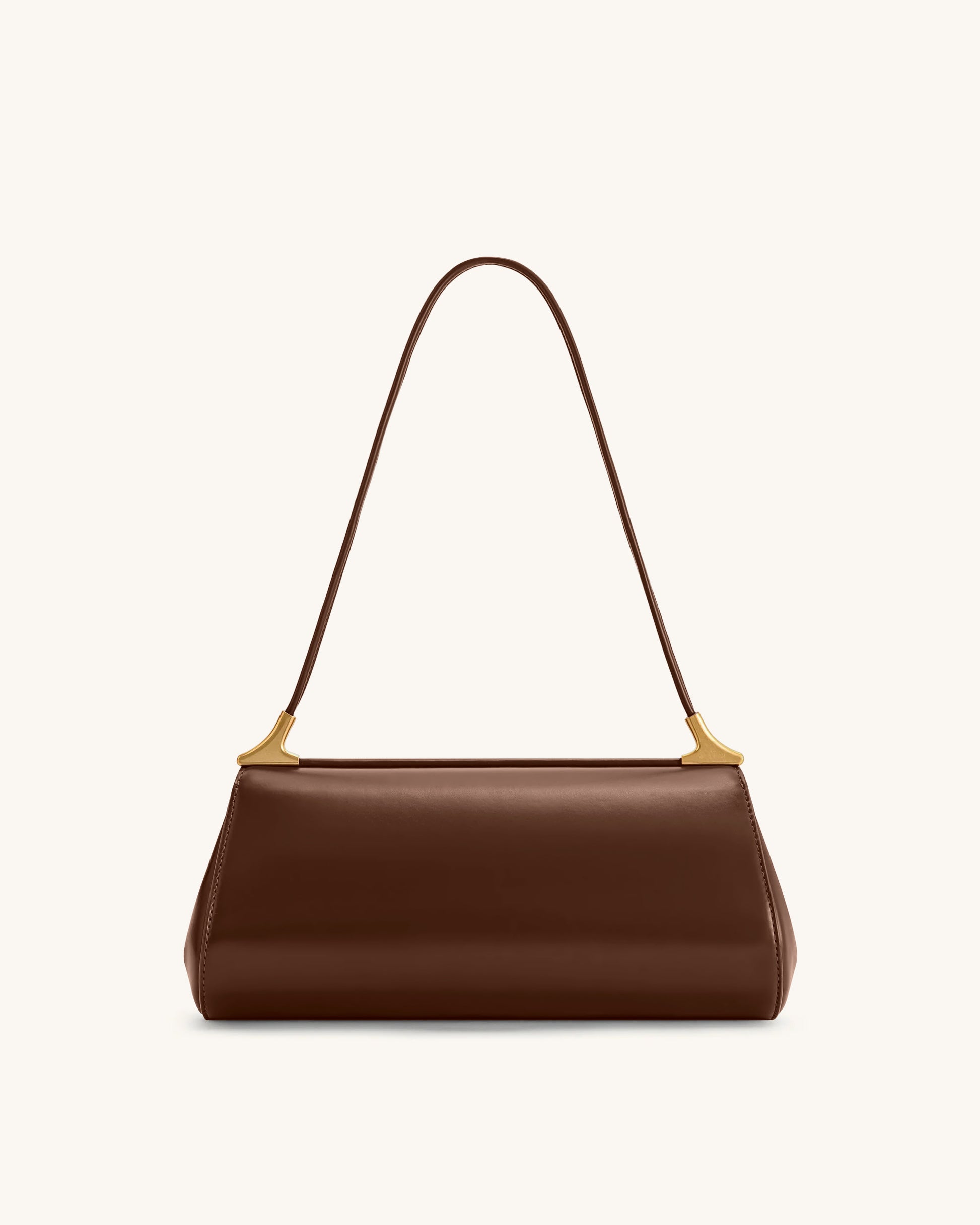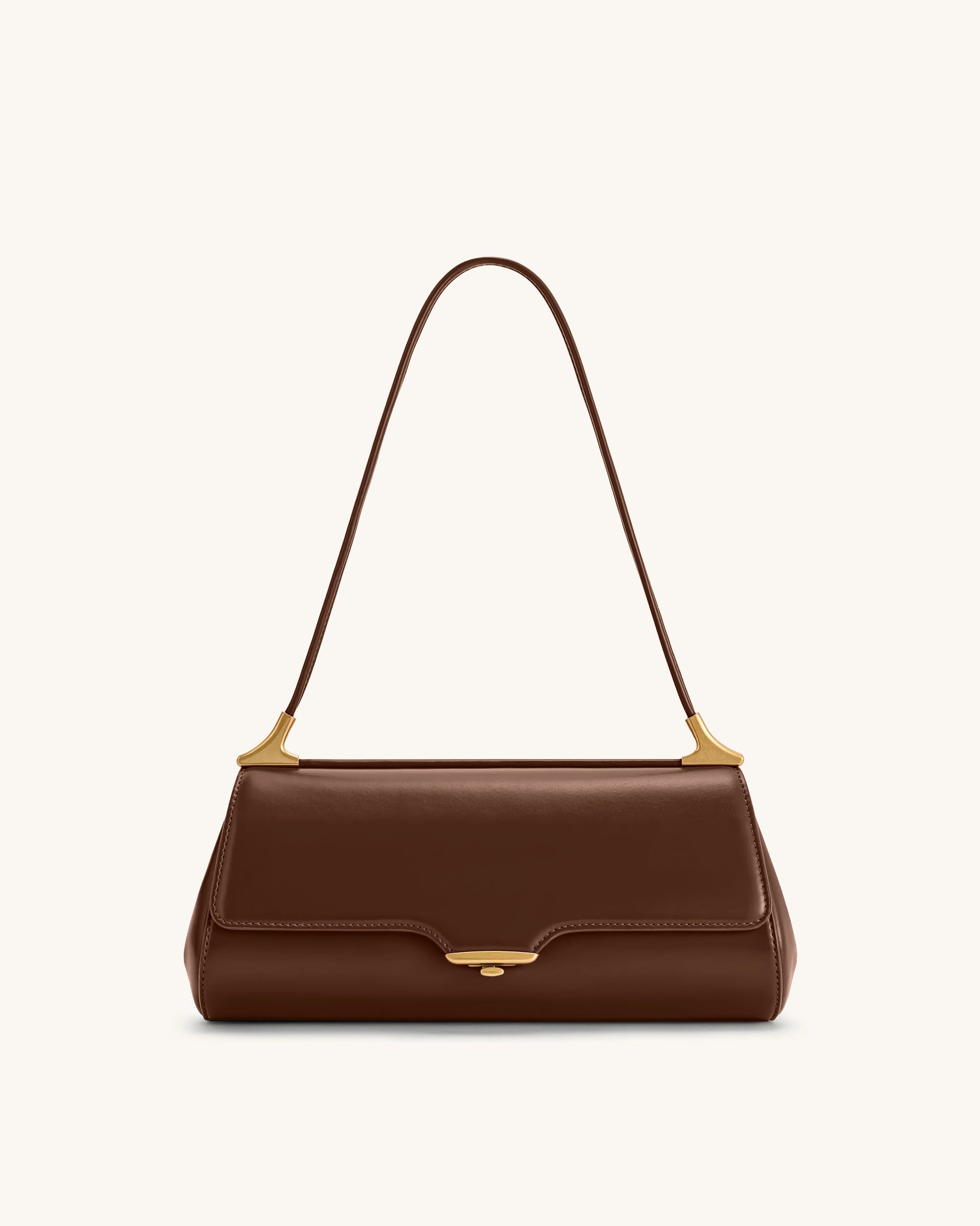 エレガントなブラウンのショルダーバッグで、洗練された構造が特徴です。ゴールドの金具が上品なアクセントを添えています。必需品の収納に適しており、日常使いにぴったりです。