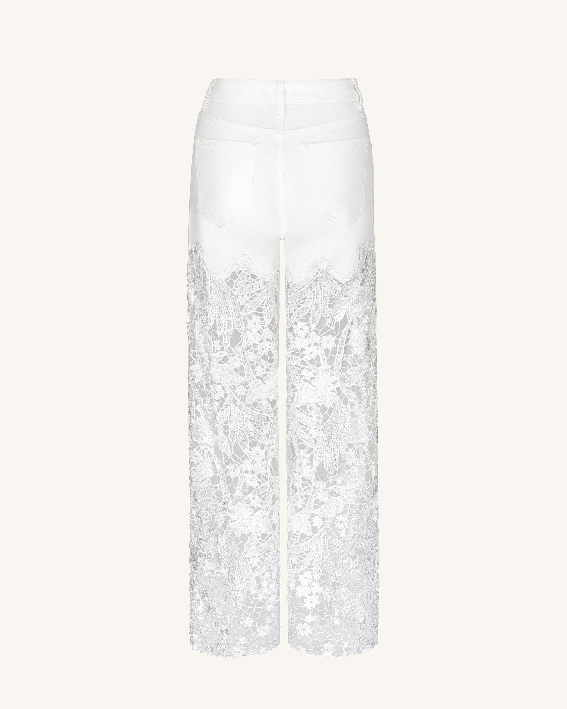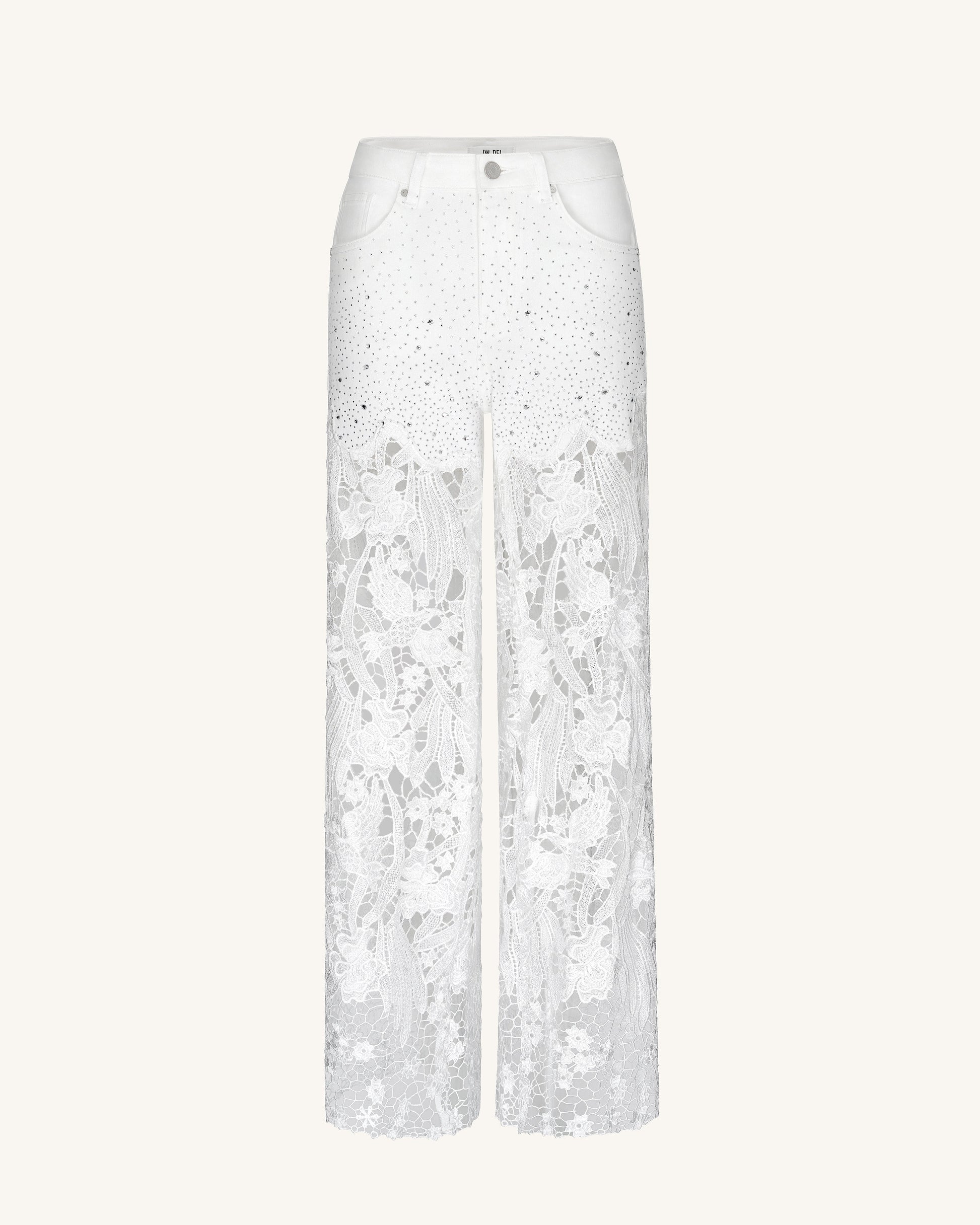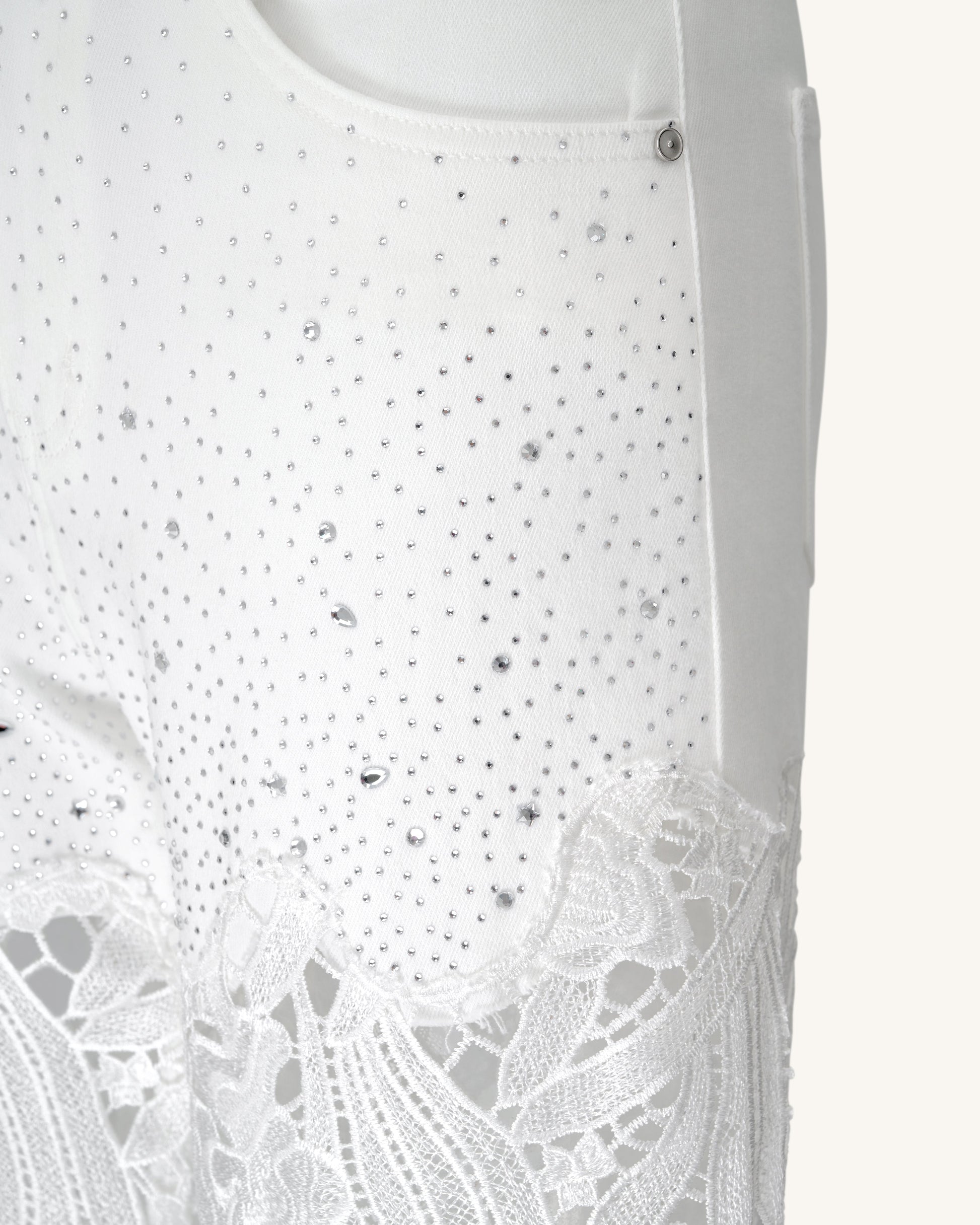 刺繍入りハイウエストワイドレースラインストーンデニムジーンズ - ホワイト