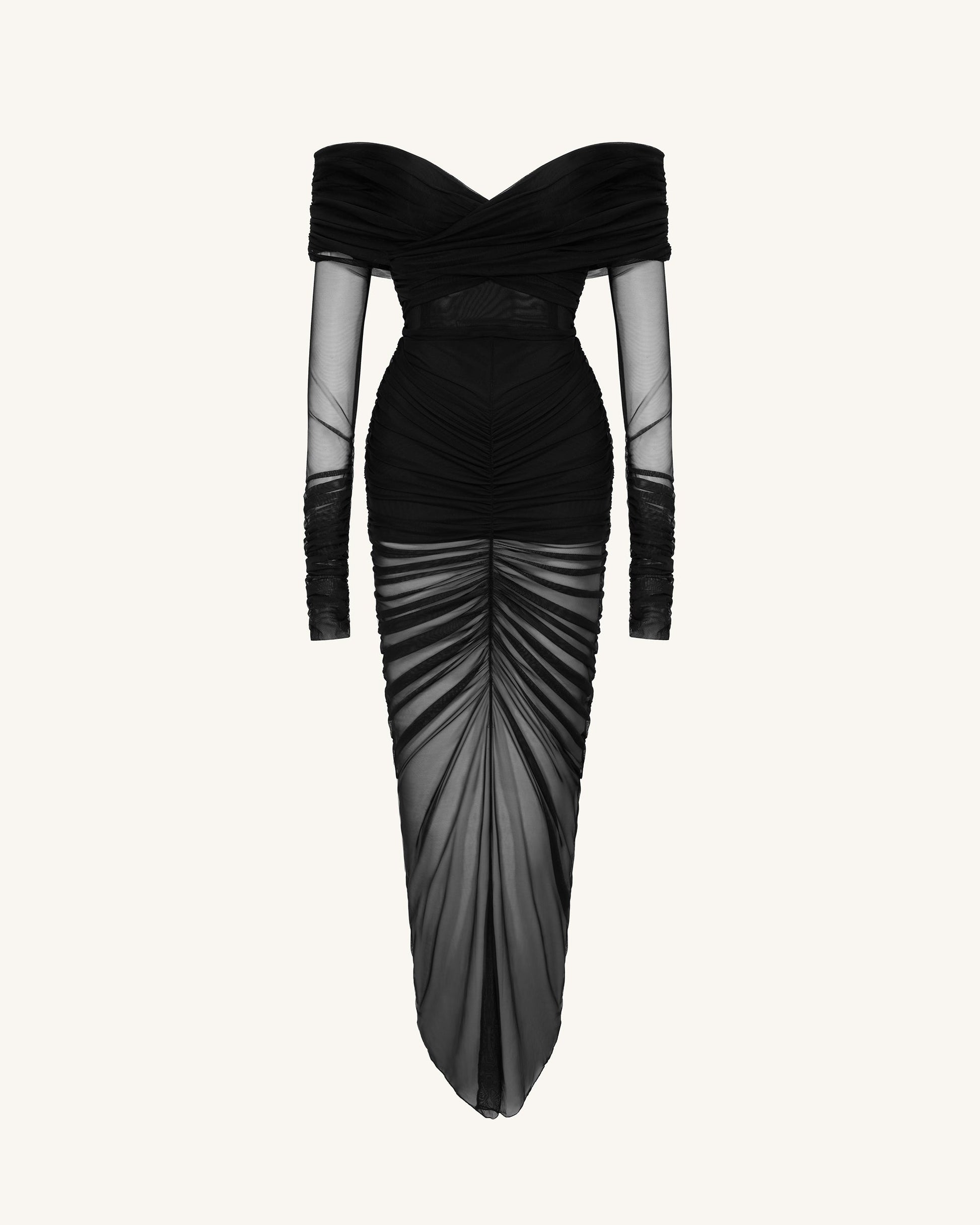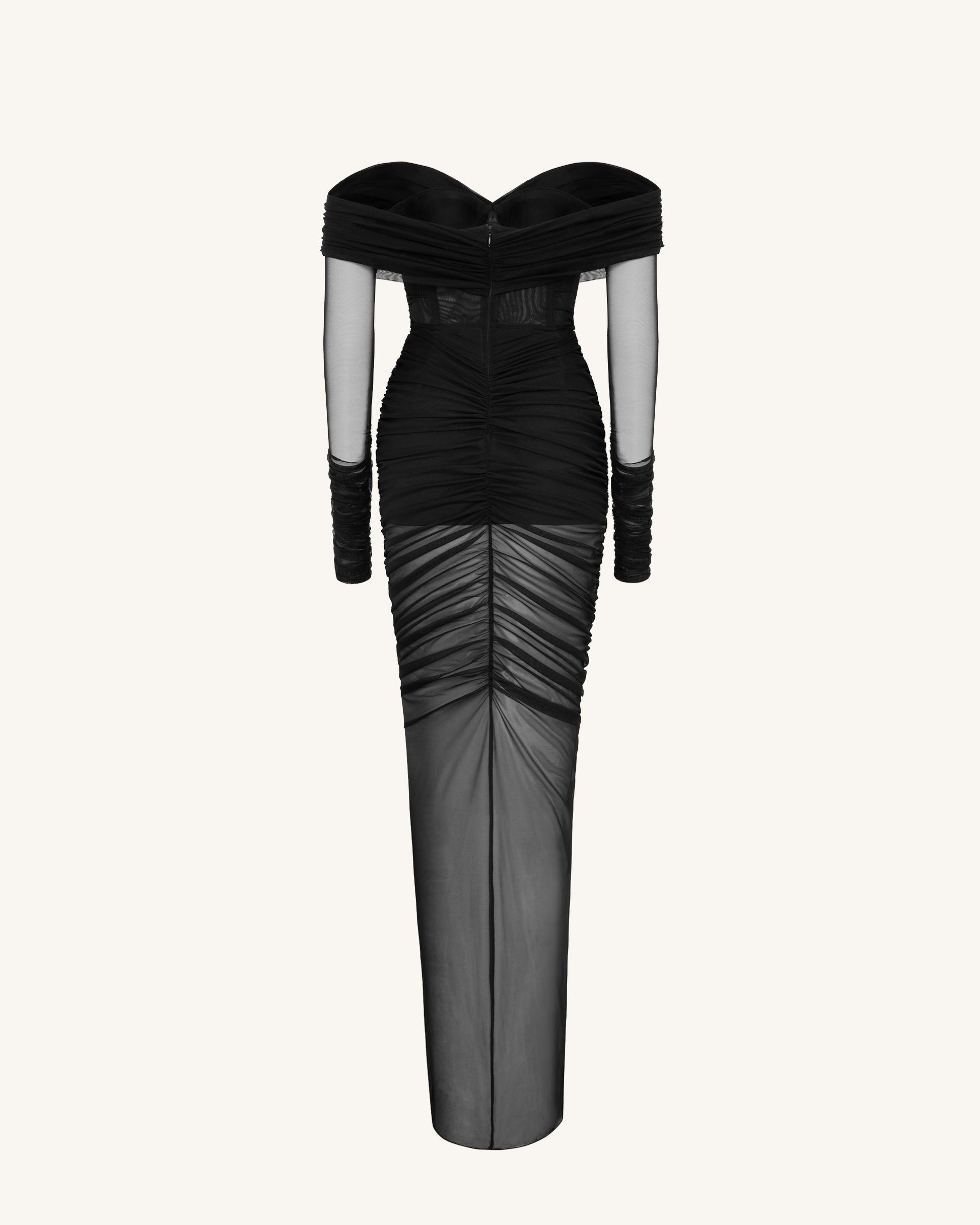 Emily エレガントオフショルダールーシュドガウン - ブラック