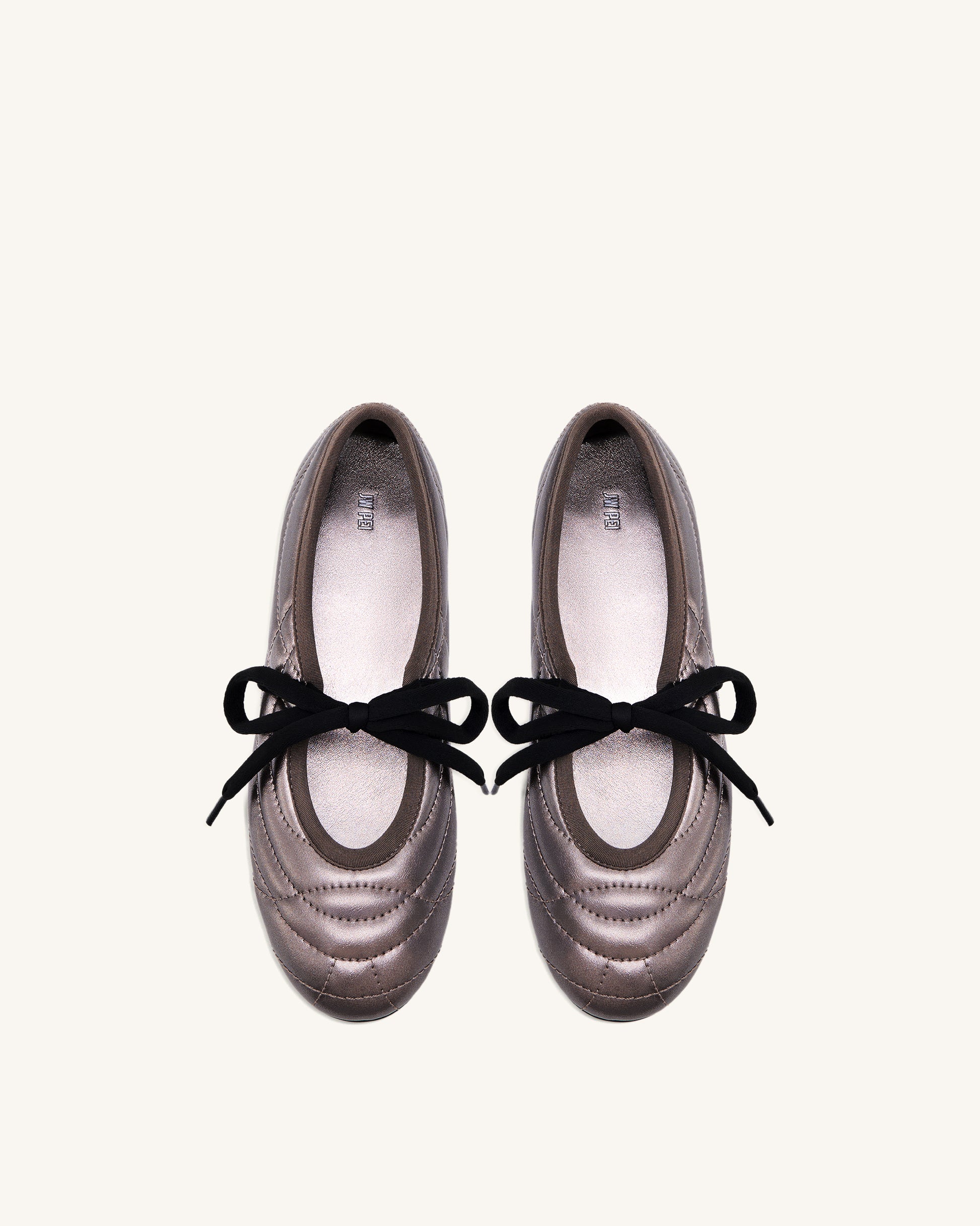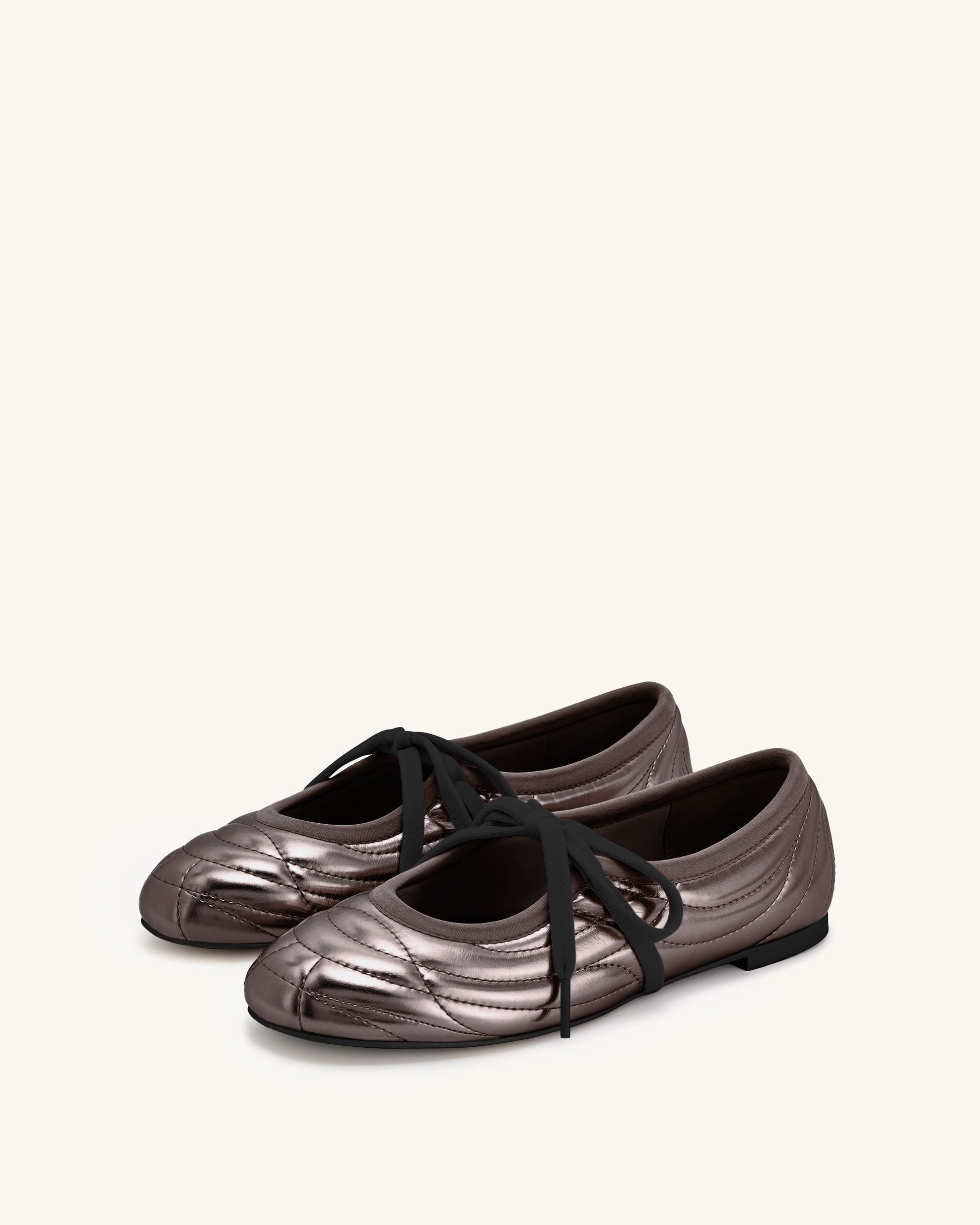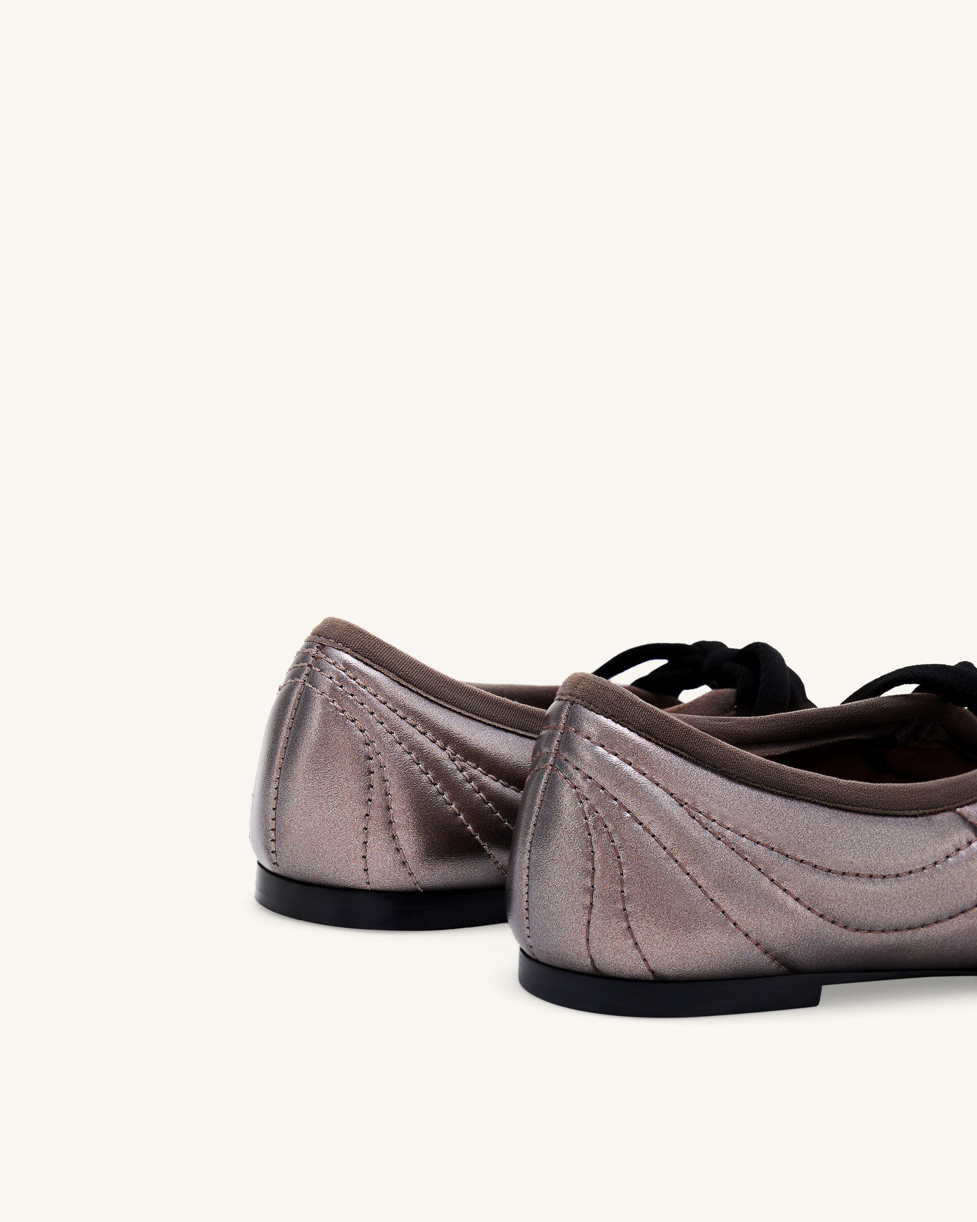 Erika トップステッチ レースアップ バレエフラットシューズ - ダークブラウン