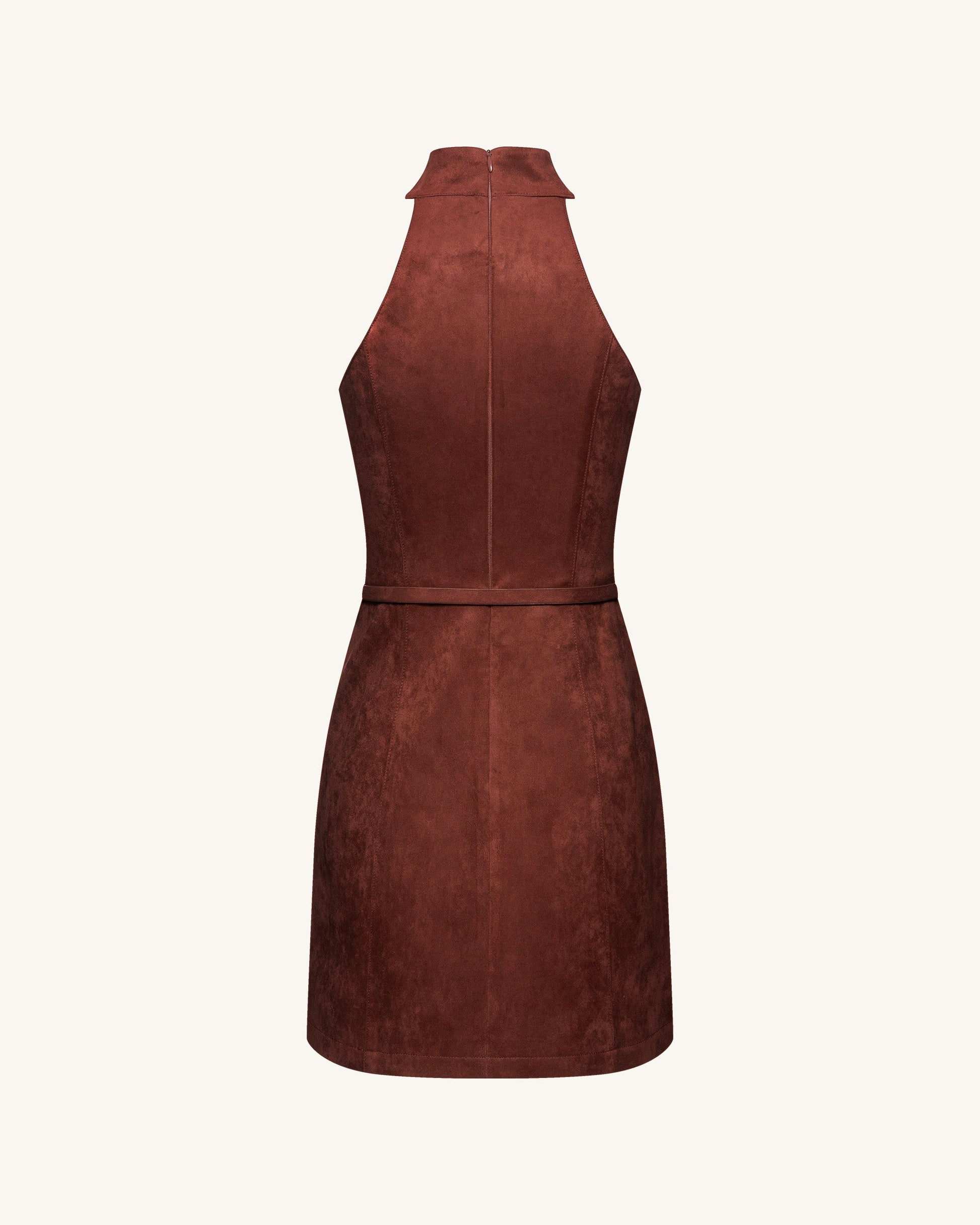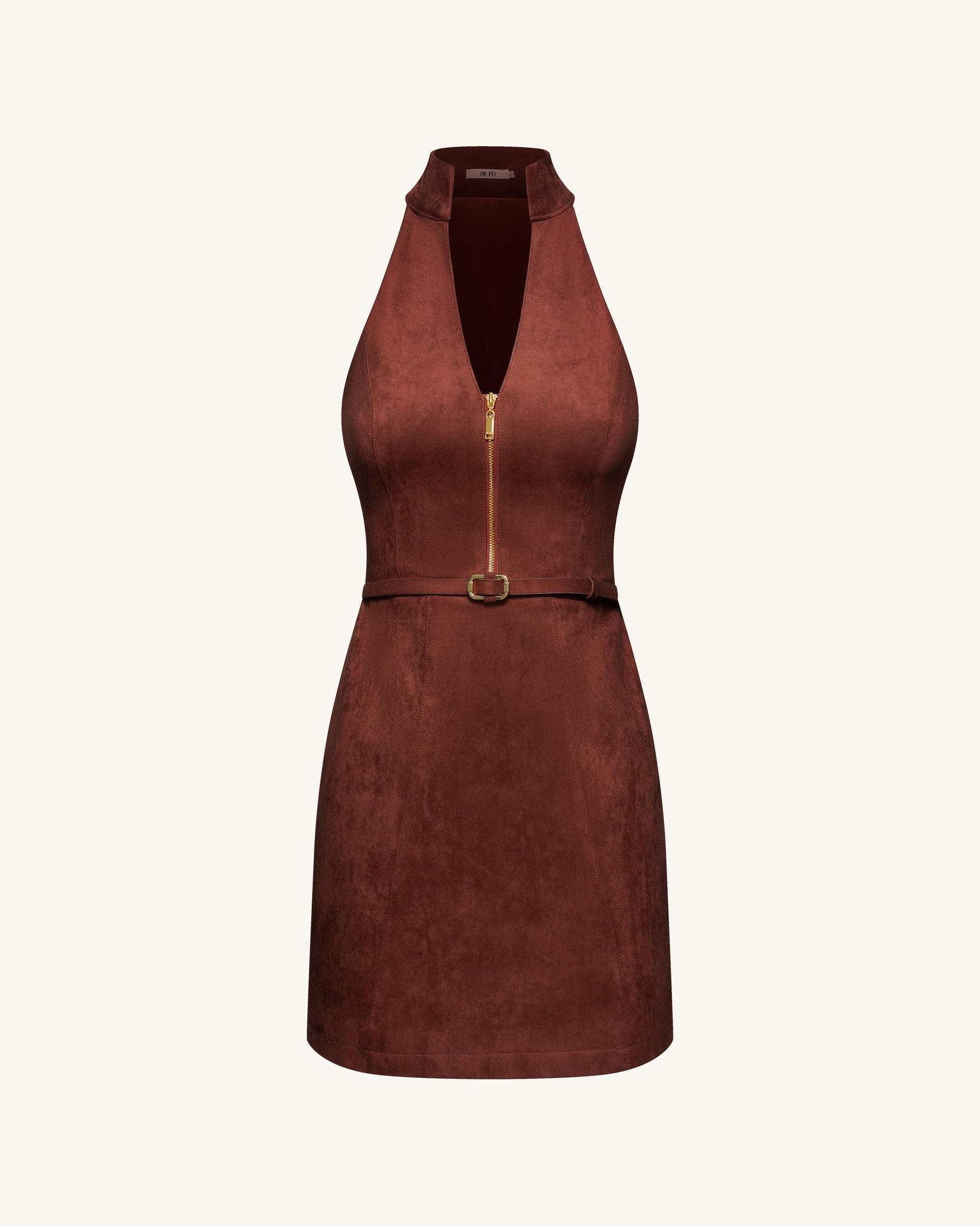 フェイクスエードハルターネックジップフロントミニドレス - バーガンディ