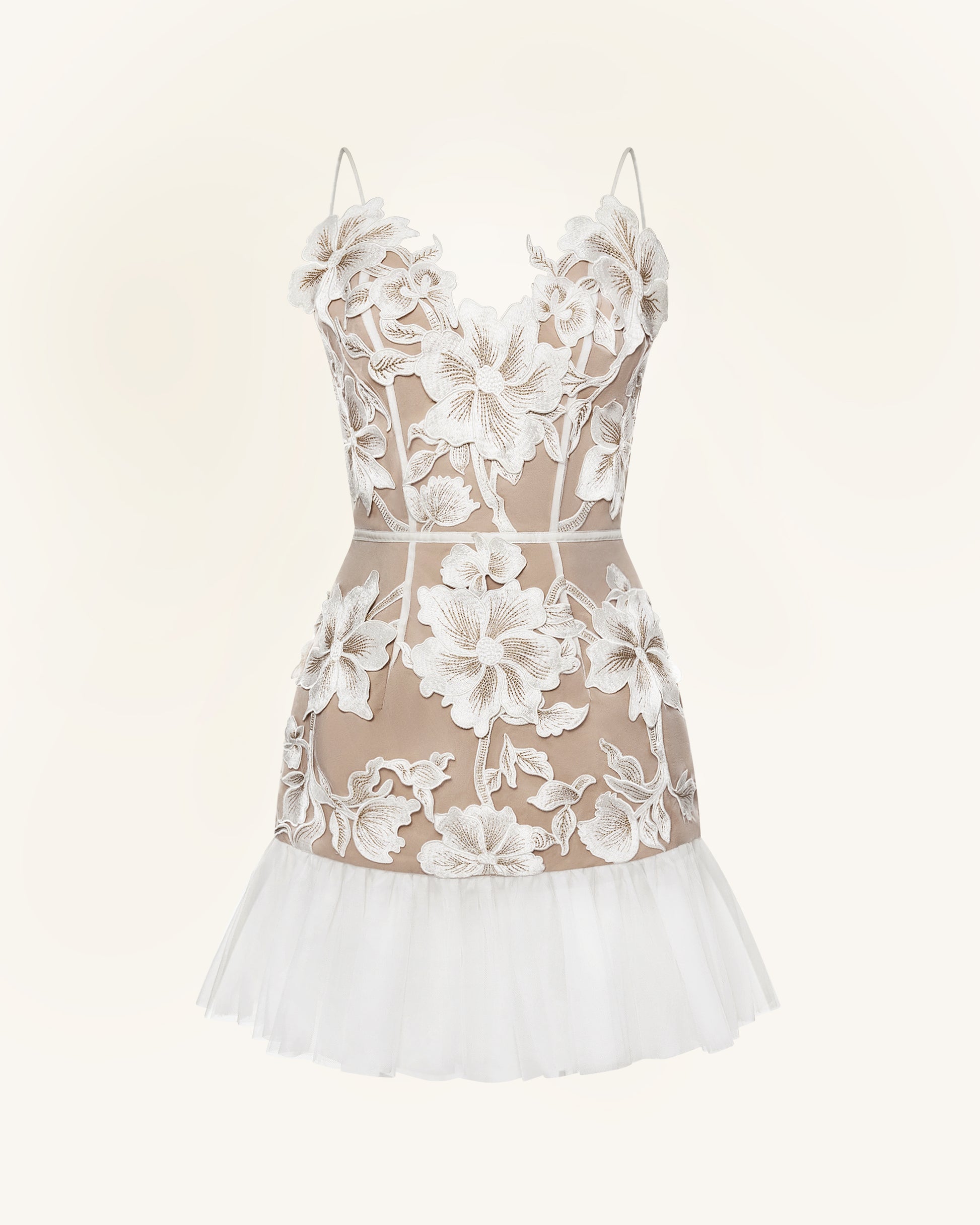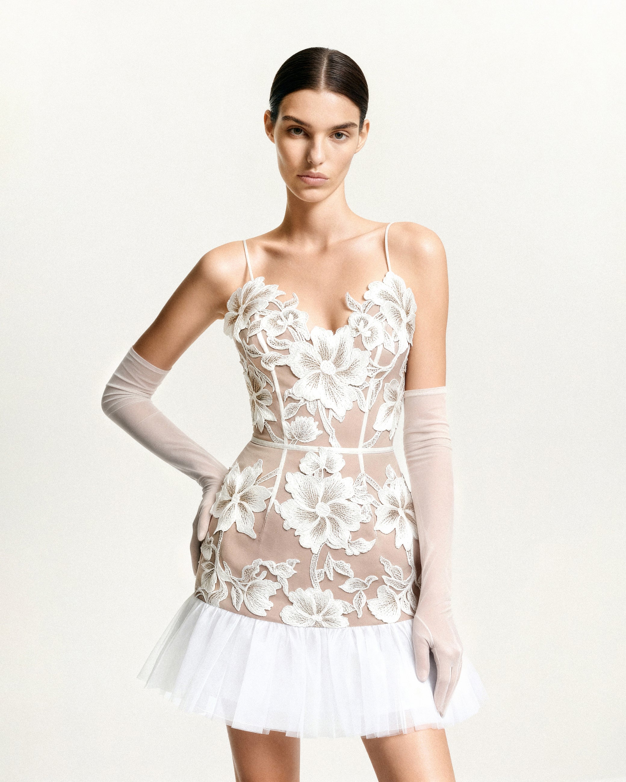 繊細な3Dフラワー刺繍があしらわれたシアーメッシュのミニドレス。ヌードトーンのベースにホワイトの花々が全体に散りばめられ、ロマンティックで上品な印象に。フィット感のあるボディスとフリルヘムが女性らしいシルエットを引き立てます。デートやブライダルイベントなど、特別な日にぴったりの一着です。