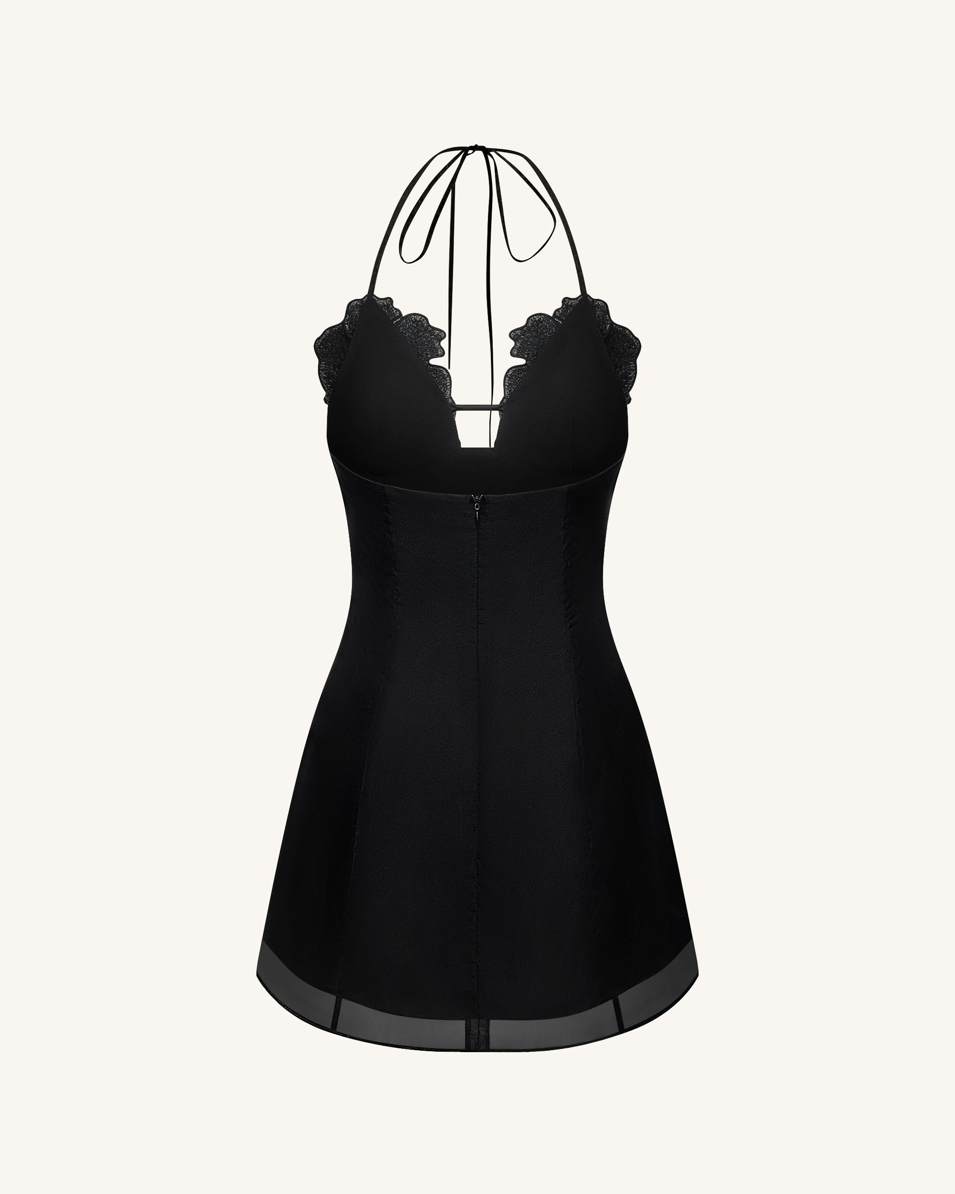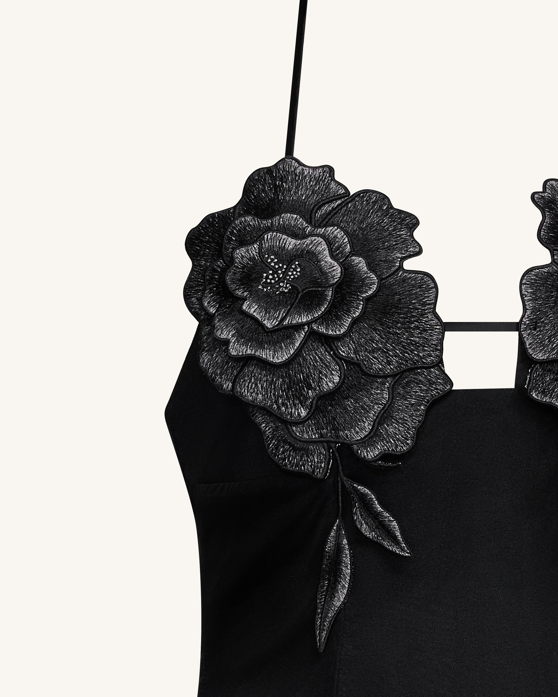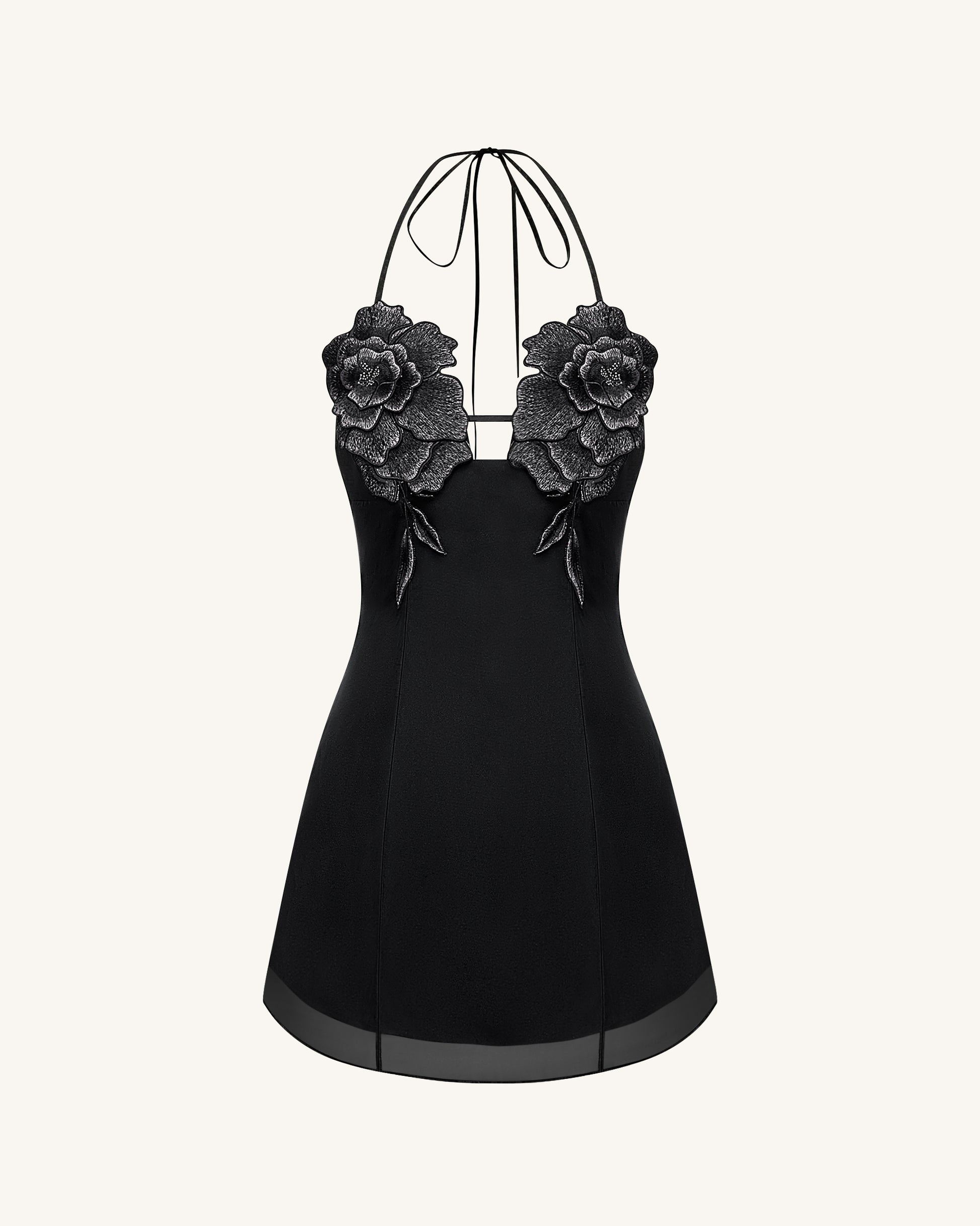 大胆な3Dフラワーアップリケがバストを飾る、ブラックのホルターネックミニドレスで華やかな登場を。タイバック仕様のホルターネックで調節が可能、デコルテを美しく引き立てながら魅力を添えます。Aラインシルエットとシアーな裾がエレガントな印象を演出。パーティーやナイトアウト、存在感のあるスタイリングにぴったりの一着です。