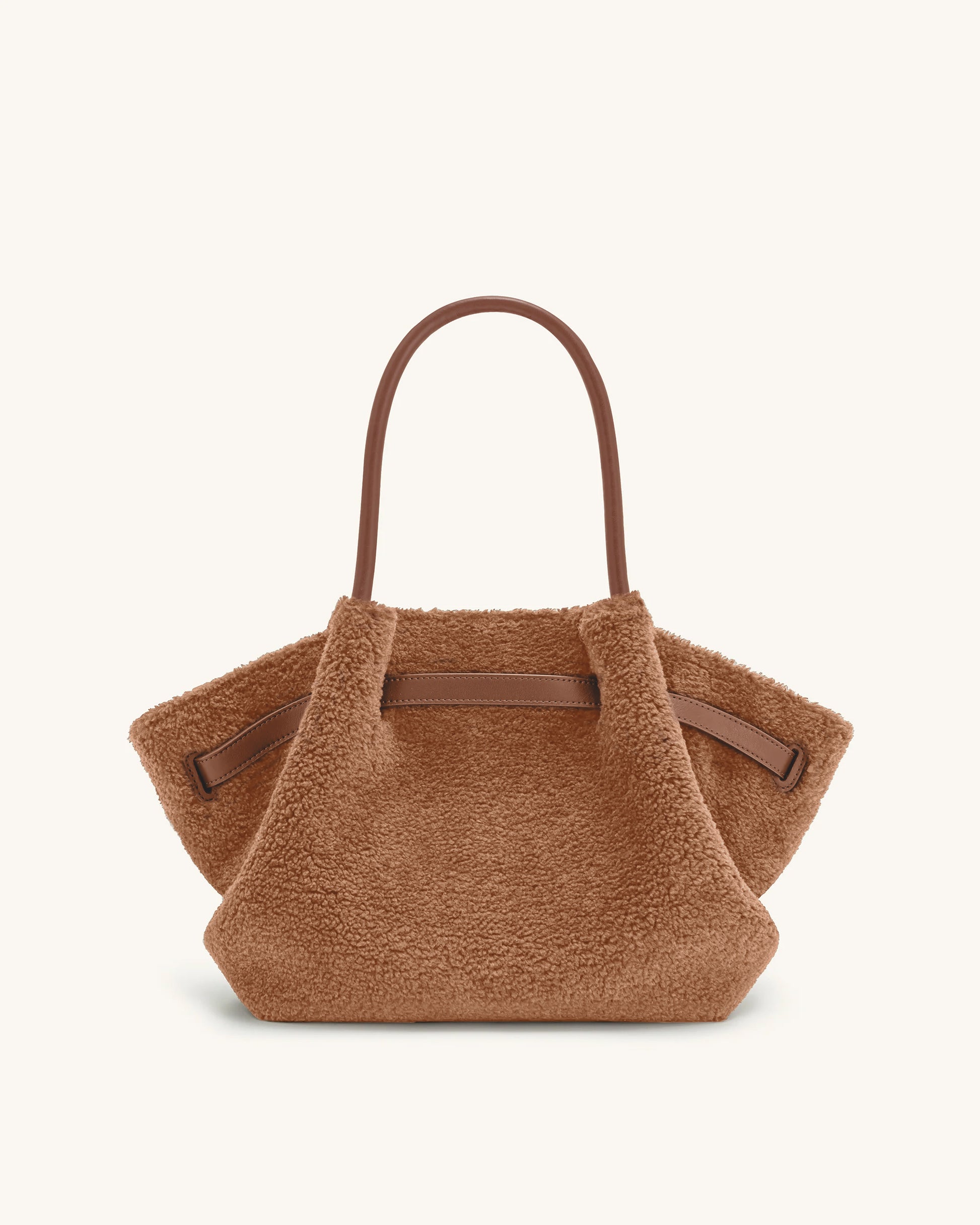 コーヒーブラウンの台形トートバッグは、ふわふわとしたシアリング風の素材感と、柔らかさの中に構造的なシルエットを兼ね備えたデザインが魅力。長めのハンドルとゆったりとした収納力で、暖かみとスタイルを両立し、寒い季節にぴったりのアクセサリーです。