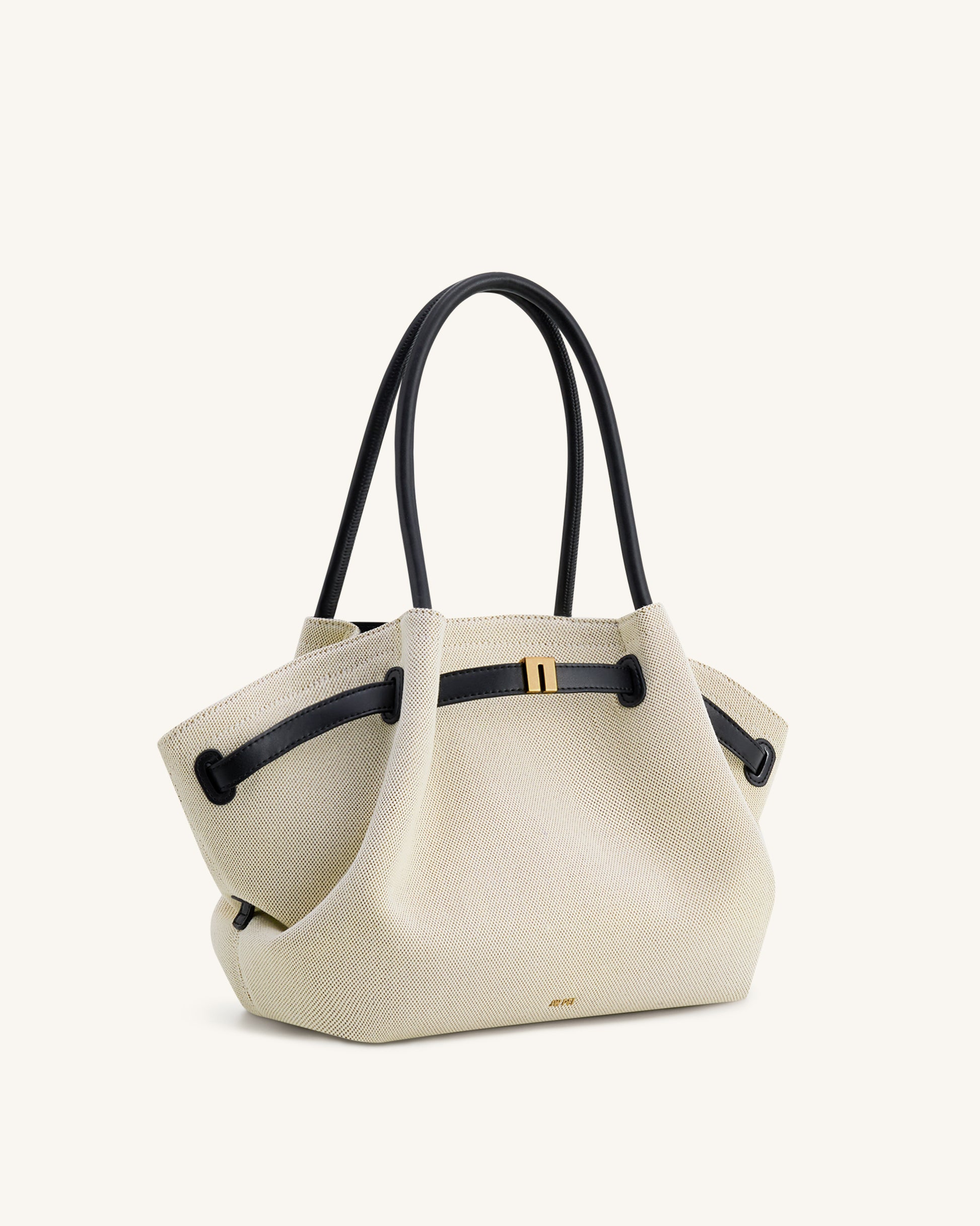 クリーム色のテクスチャードキャンバス素材のボディに、ブラックのハンドルとトリムを合わせた台形トートバッグ。開口部がオープントップのシルエットで、ゴールドトーンのアクセントが洗練されたミニマルな印象を与えます。仕事やブランチ、日常のちょっとしたお出かけにぴったりです。