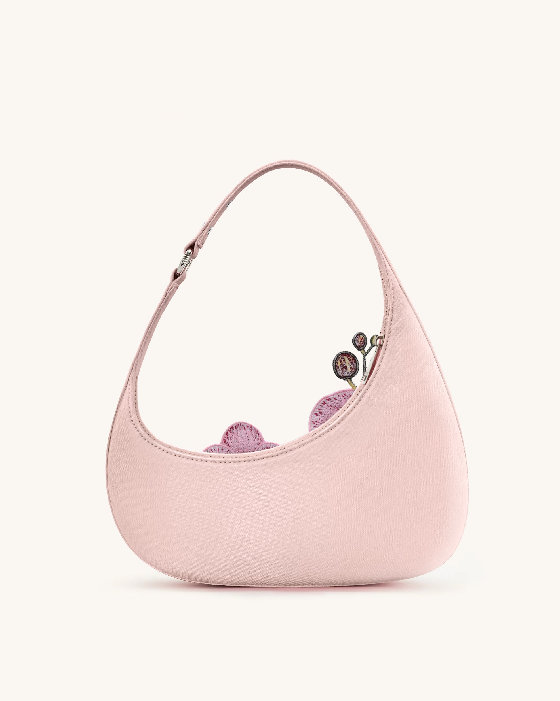 エレガントな曲線シルエットと印象的な蘭の刺繍が特徴のピンクのショルダーバッグ。テクスチャード生地で構造的なフォルムに仕上げられており、日常使いにぴったりな、アーティスティックな雰囲気を添えたアイテムです。
