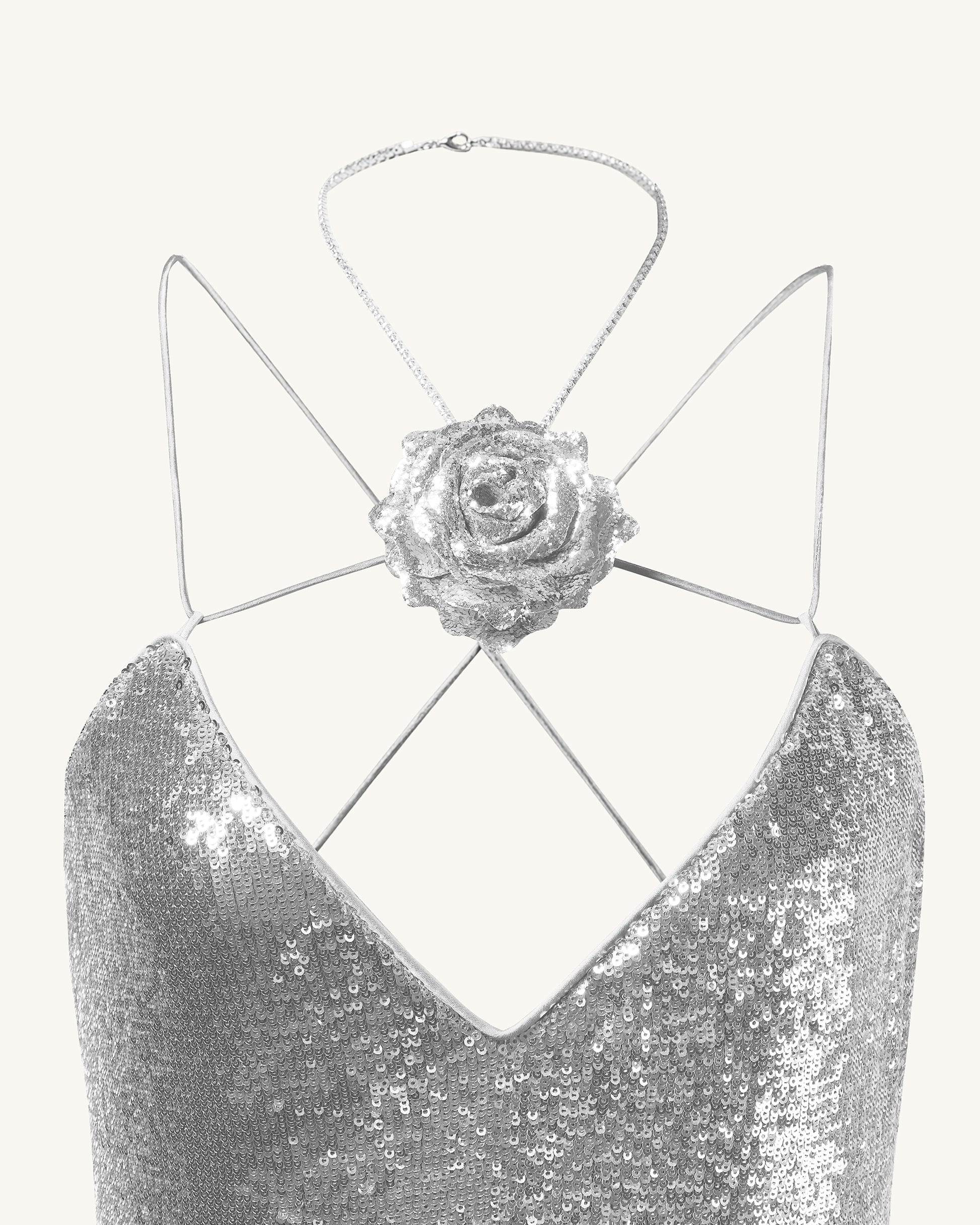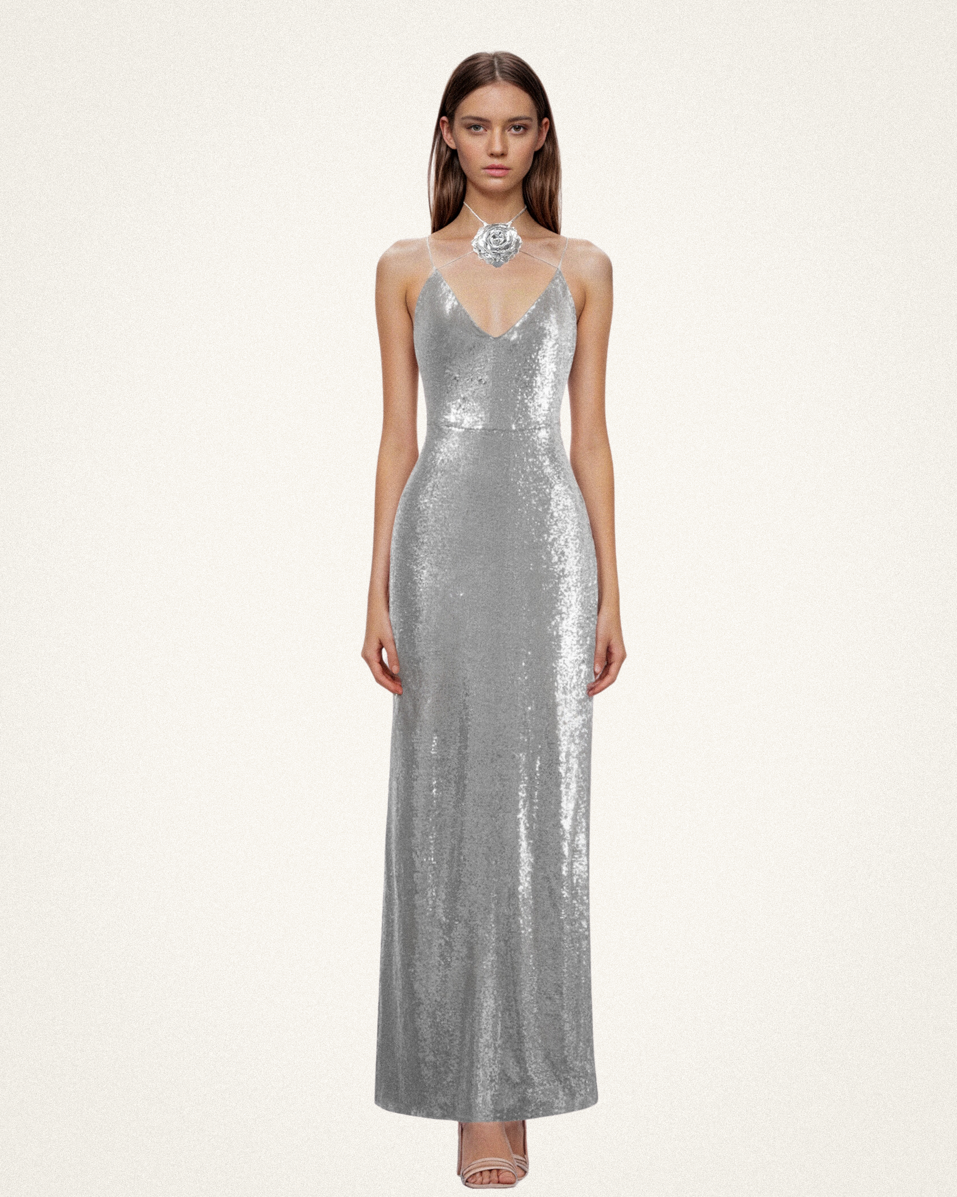 Heisey シルバーのシーケンスが施されたロゼット付きマキシドレス - シルバー