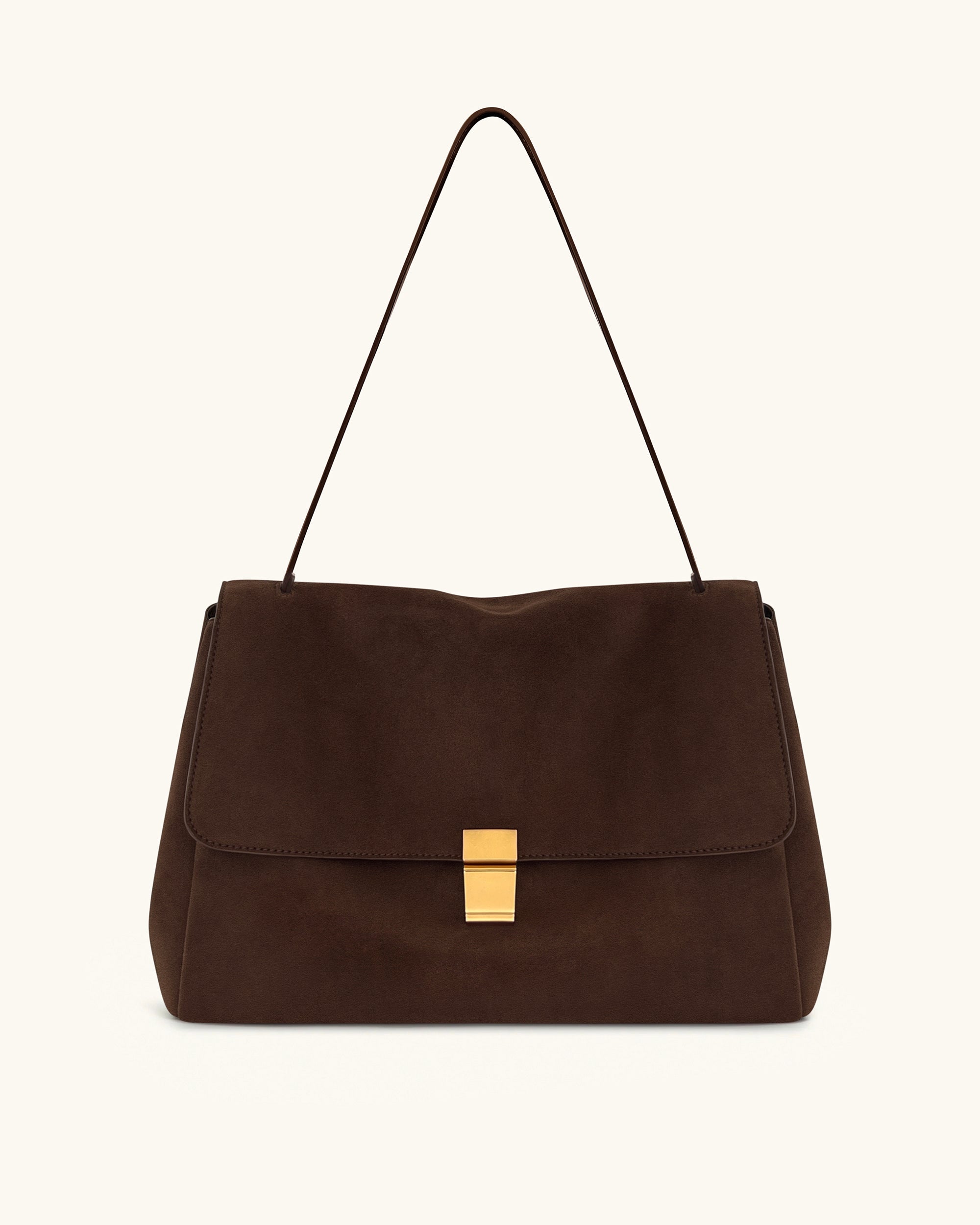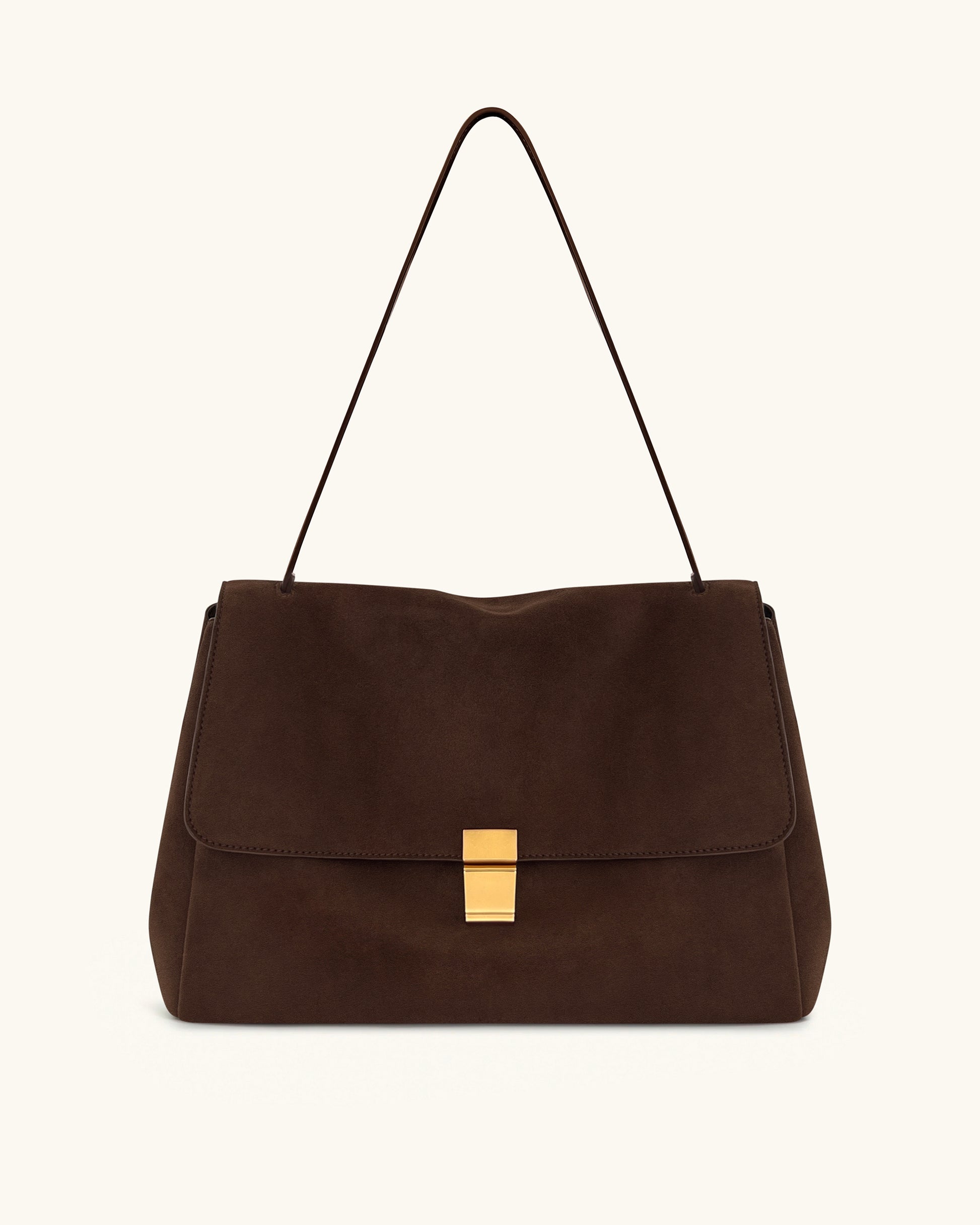 上品なダークブラウンのフェイクスエード素材を使用した、シックなショルダーバッグ。かっちりとしたシルエットに、ゴールド調の留め具と細身のショルダーストラップを合わせ、日常のスタイルにさりげないエレガンスを添えてくれます。
