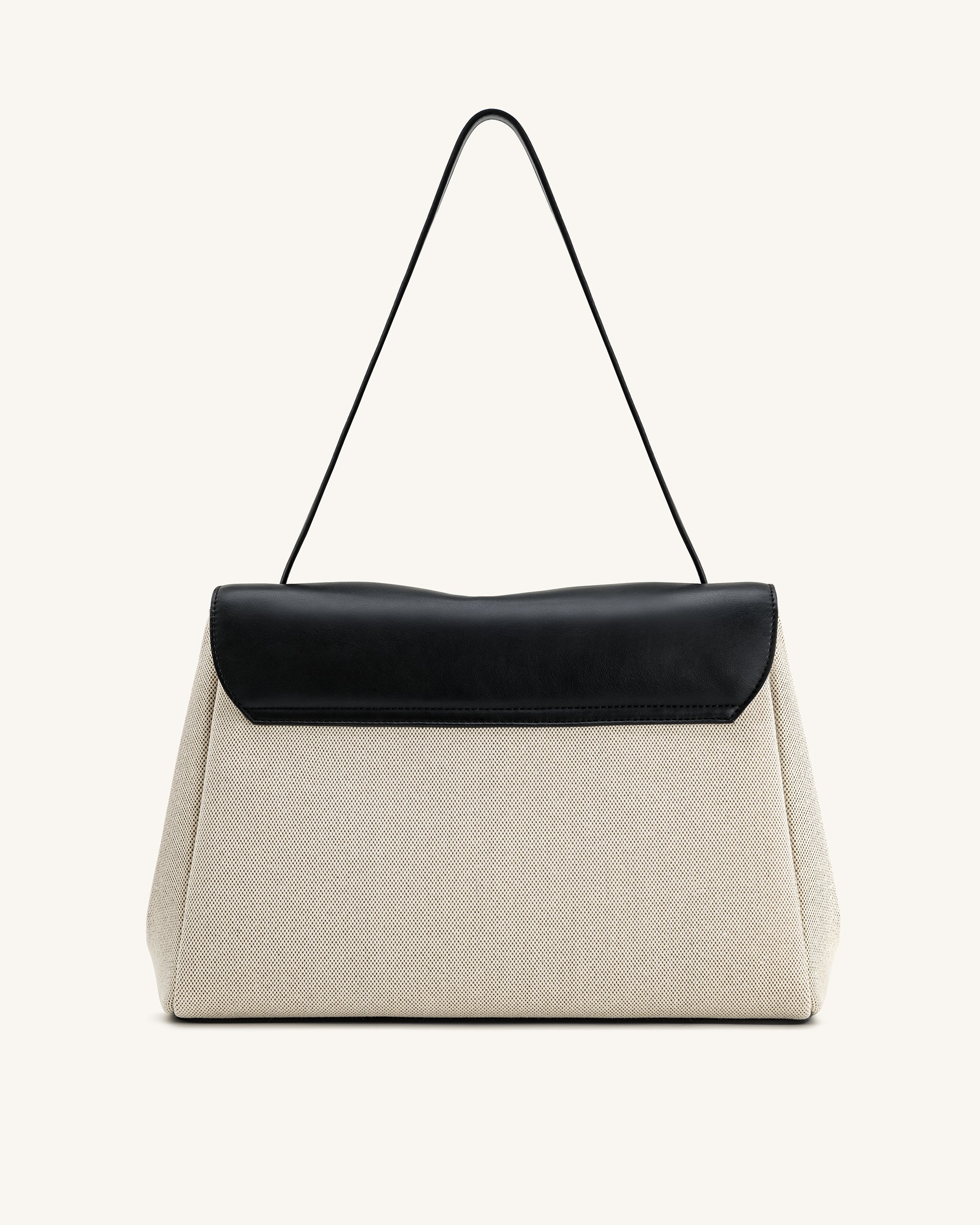 ブラックのフェイクレザーフラップとベージュのキャンバス地ボディによる、コントラストが映えるモダンなデザインのショルダーバッグ。かっちりとしたシルエットに、洗練されたゴールド調の留め具とスリムなストラップを合わせており、通勤にもカジュアルなお出かけにもぴったりです。