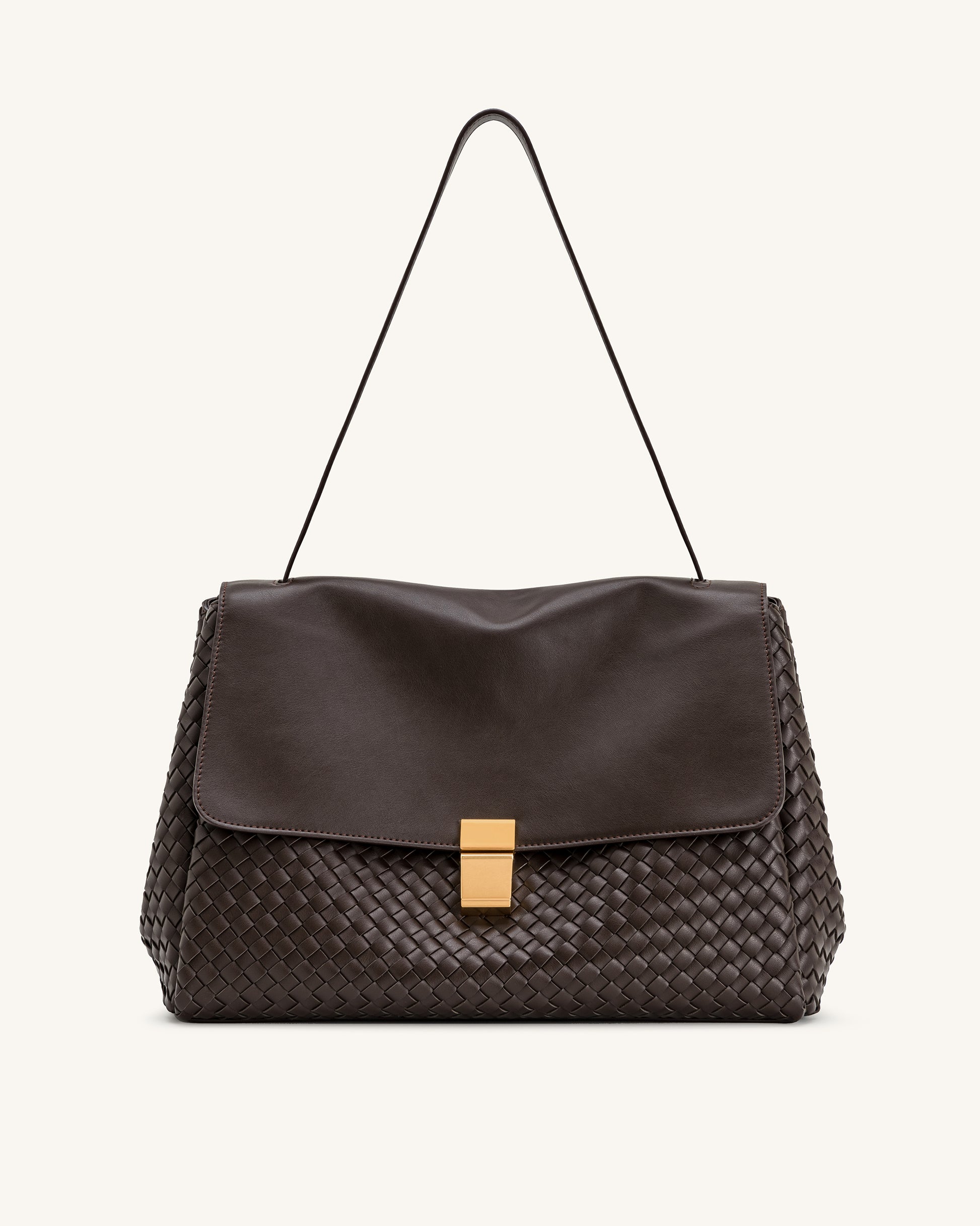 滑らかなフェイクレザーのフラップと、深みのあるエスプレッソカラーの編み込みベースを組み合わせた、洗練されたショルダーバッグ。ゴールド調の留め具とミニマルなストラップがアクセントとなり、タイムレスなエレガンスと日常使いに適した実用性を兼ね備えています。