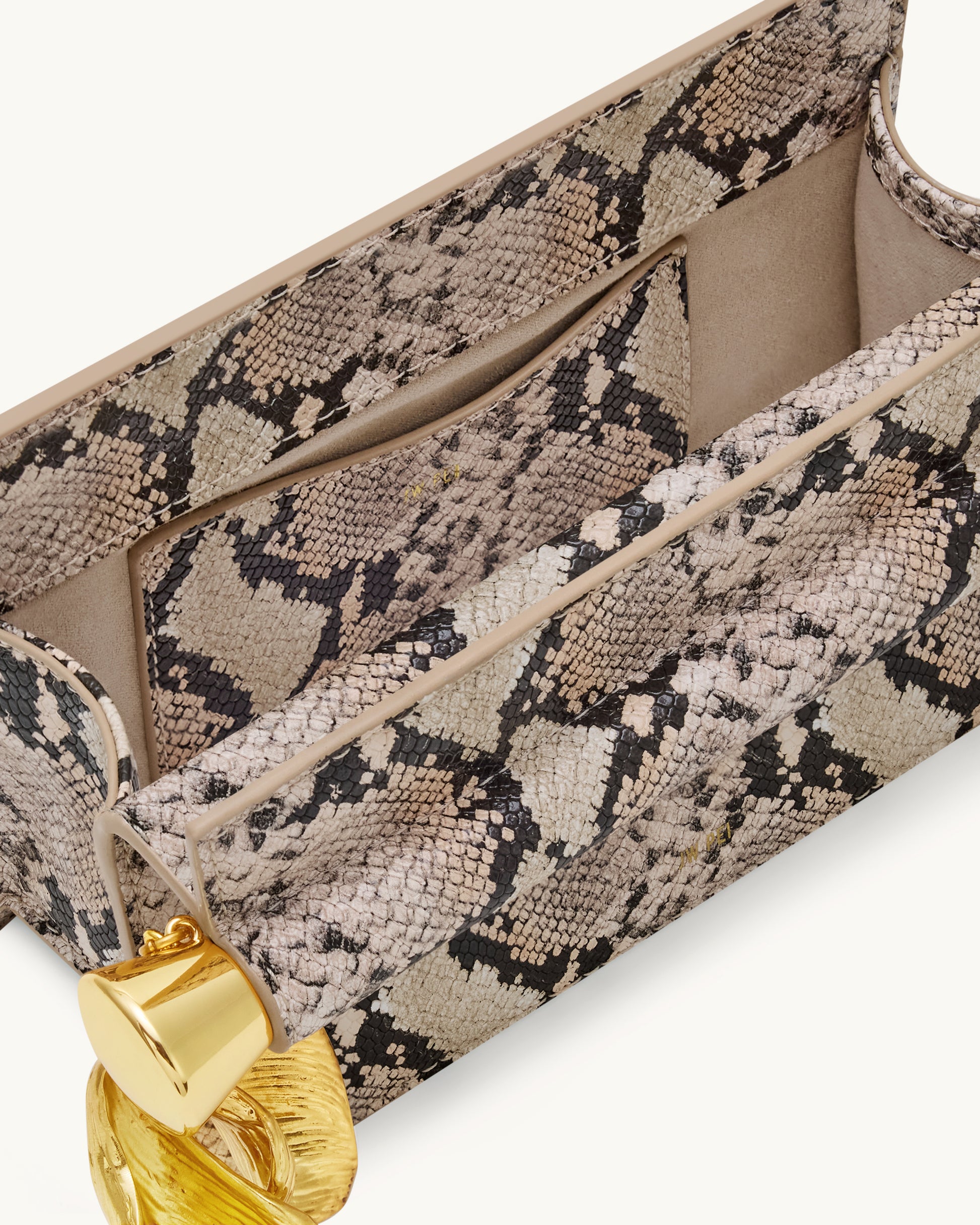 コンパクトなヴィーガンレザーのクラッチバッグで、目を引くヘビ柄が特徴です。彫刻のようなチャーム付きのゴールドの金具を備えています。iPhone 16 Pro Maxと必要なものが収納可能です。イブニングや存在感のあるデイスタイルにぴったりです。