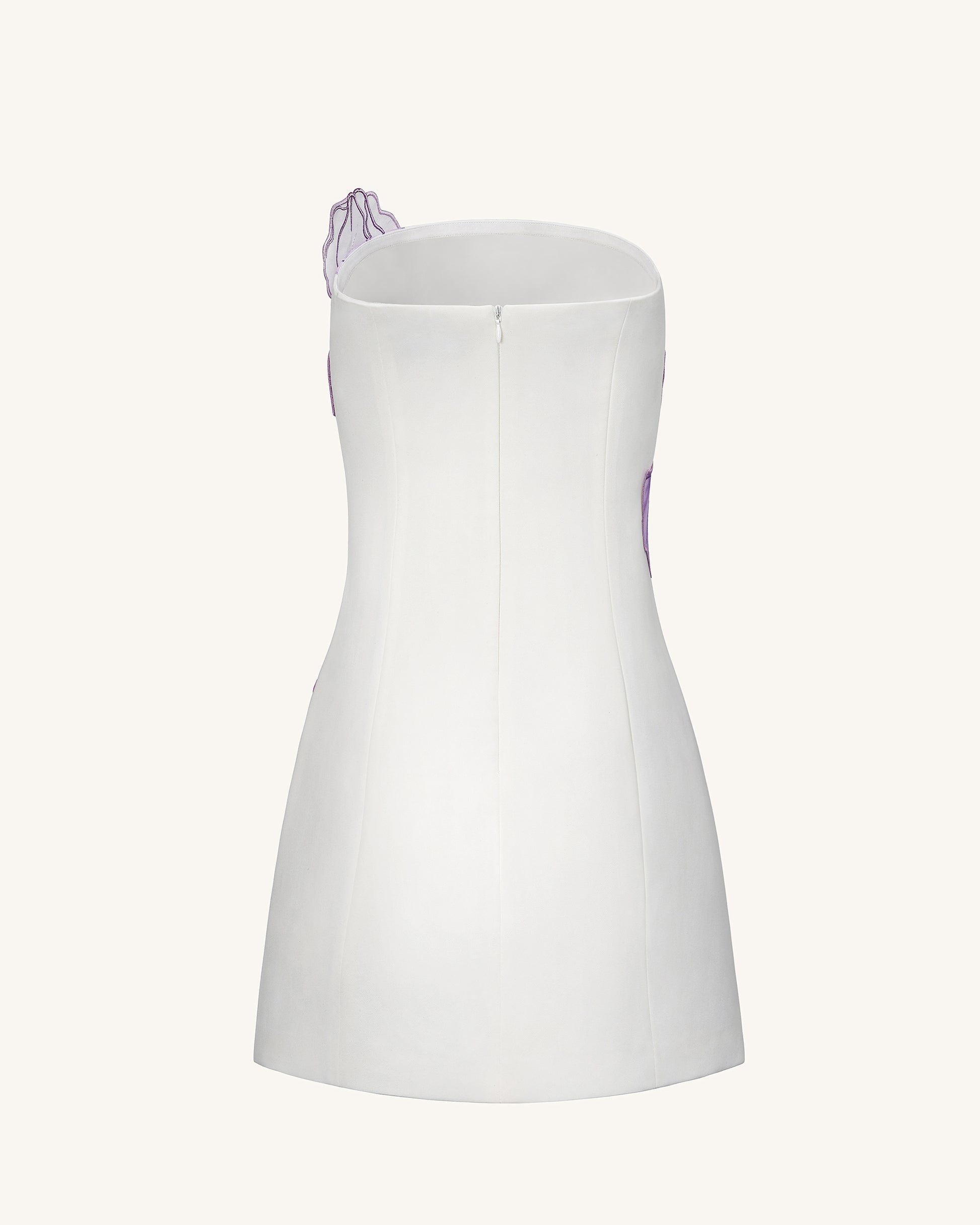 ストラップレスのミニドレスで、フィット感のあるシルエットと滑らかでハリのある生地が特徴です。フロント全体に、パステルパープルとグリーンの大きなアイリスフラワーモチーフが配され、印象的なビジュアルを演出。裾は膝上で切り替えたクリーンな仕上げ。ミニマルなデザインに、存在感のある花柄グラフィックが映えます。