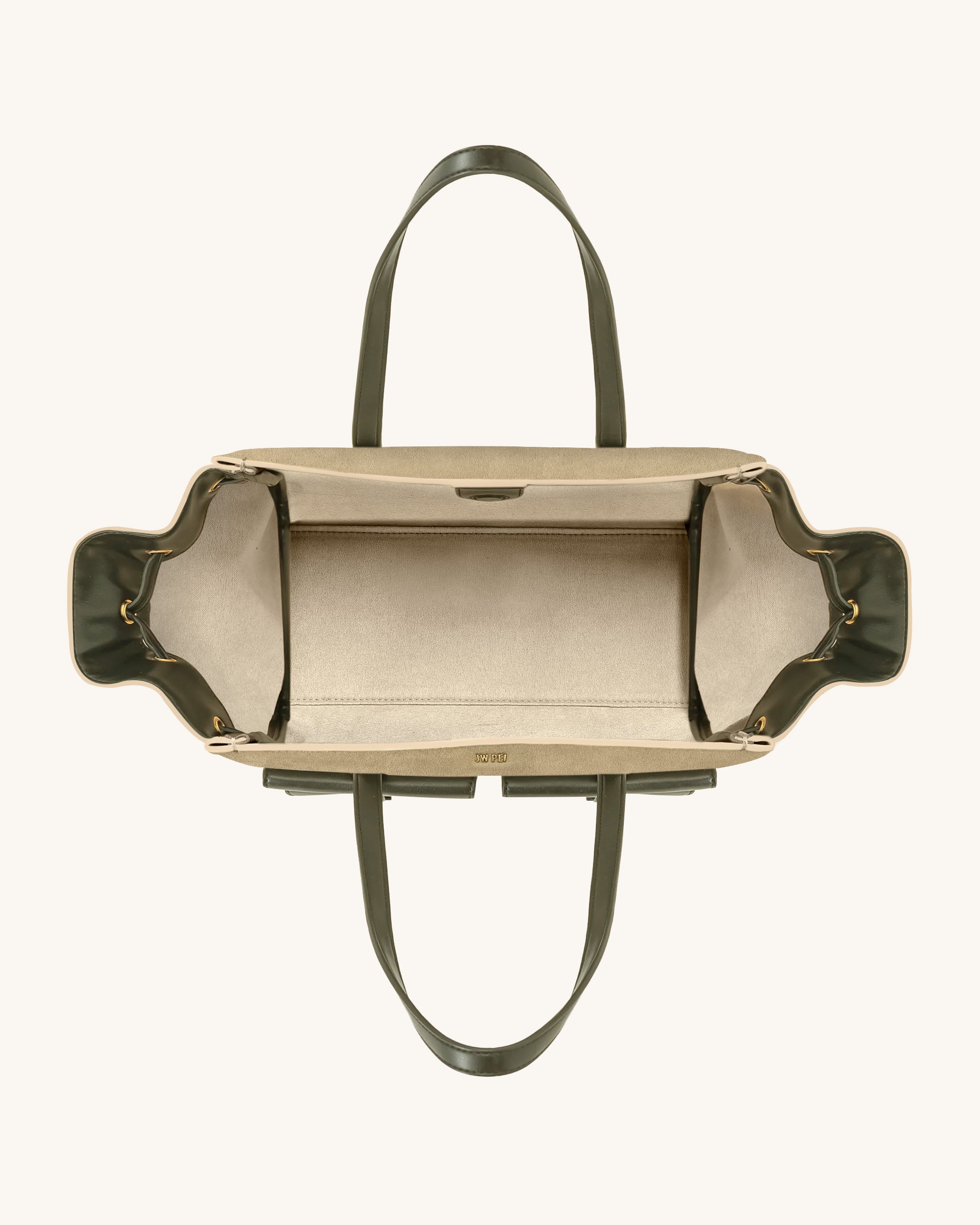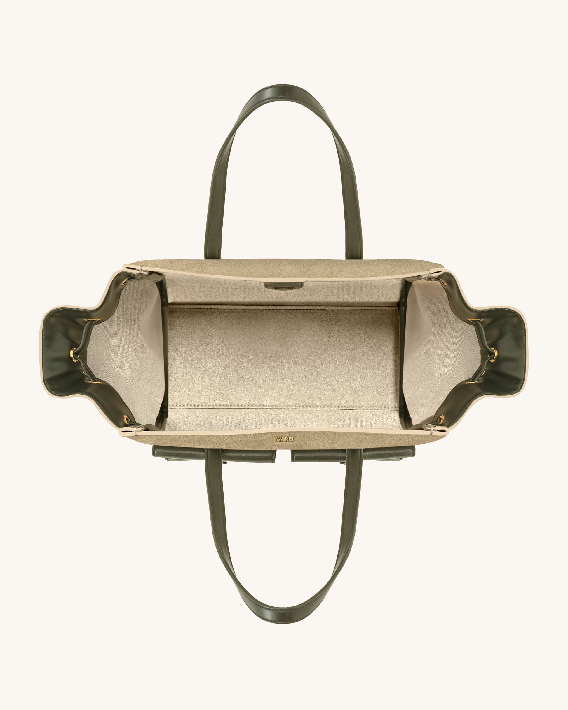 広々として多用途、かつシックなデザイン。ゴールドの金具をあしらった二つのフロントポケットと、柔らかなスエード調の仕上げが特徴です。日常の必需品やiPad Miniの収納に適しています