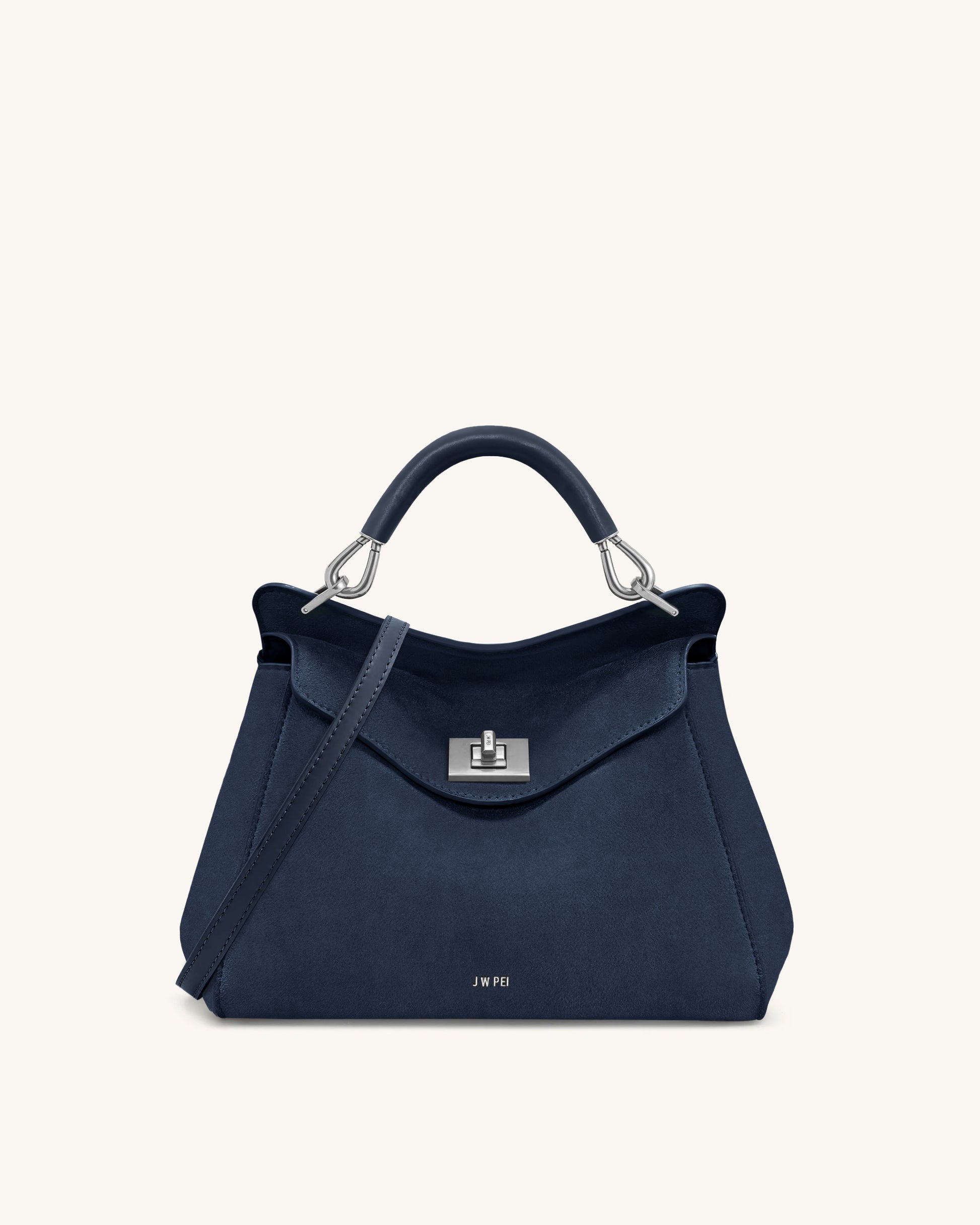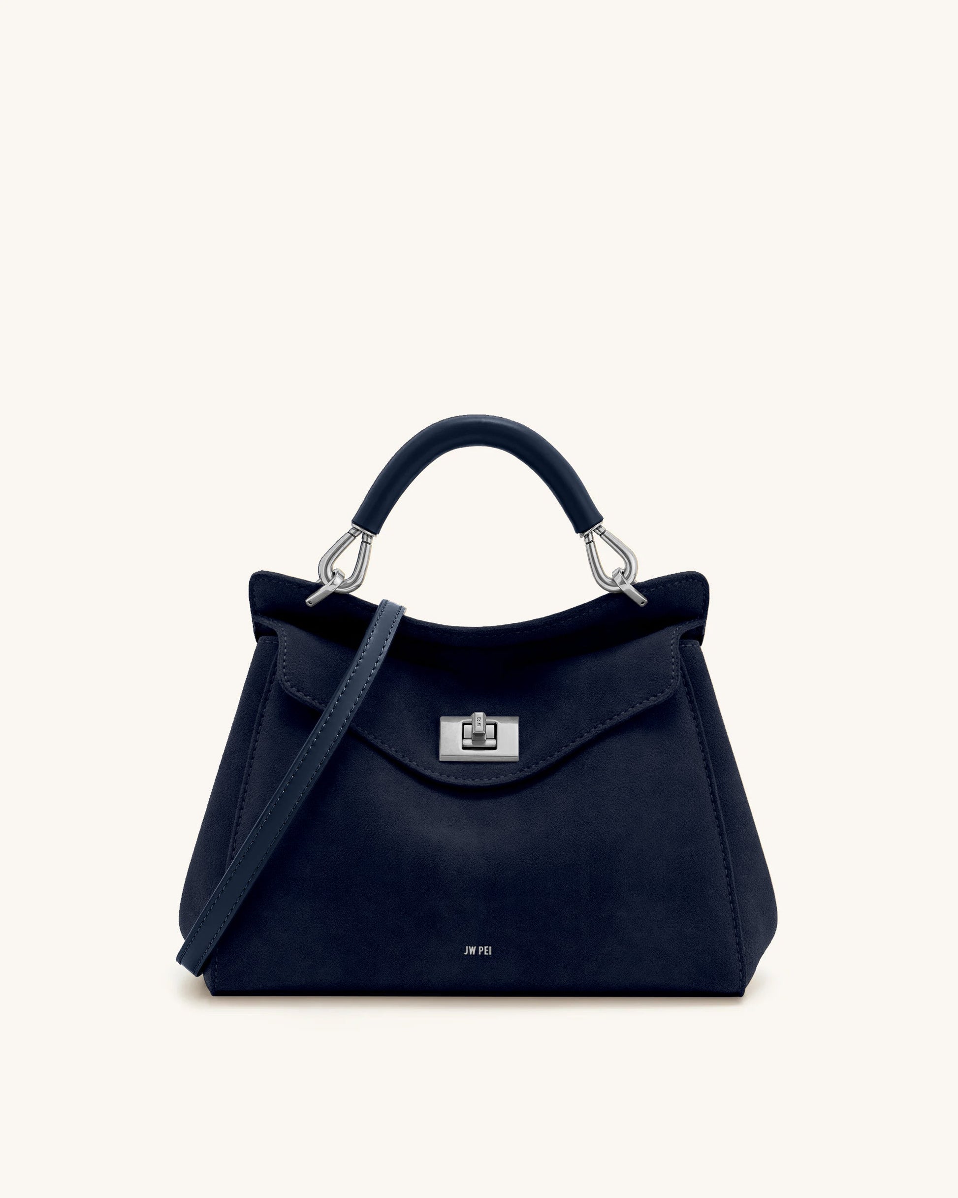 クラシックなネイビーブルーのエレガントなトップハンドルバッグ。スエード調の柔らかな質感と、洗練されたシルバートーンのツイストロックが特徴です。構造的なハンドルと取り外し可能なクロスボディストラップを備え、タイムレスな上品さと日常的な機能性を兼ね備えています。通勤やミーティング、街歩きにもぴったりのアイテムです。