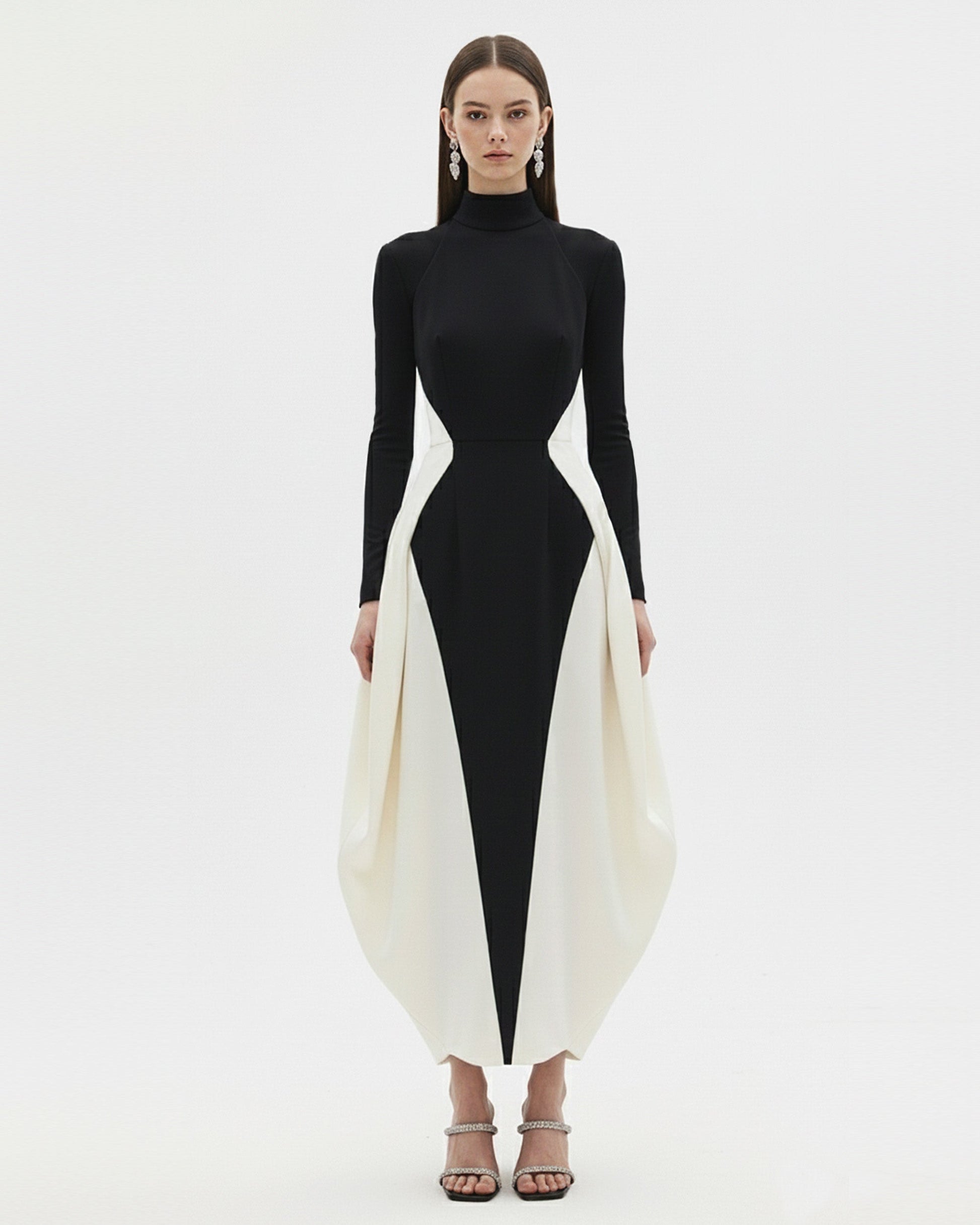 モノクロ パネル切り替え 長袖 マキシ丈ワンピース - ブラック