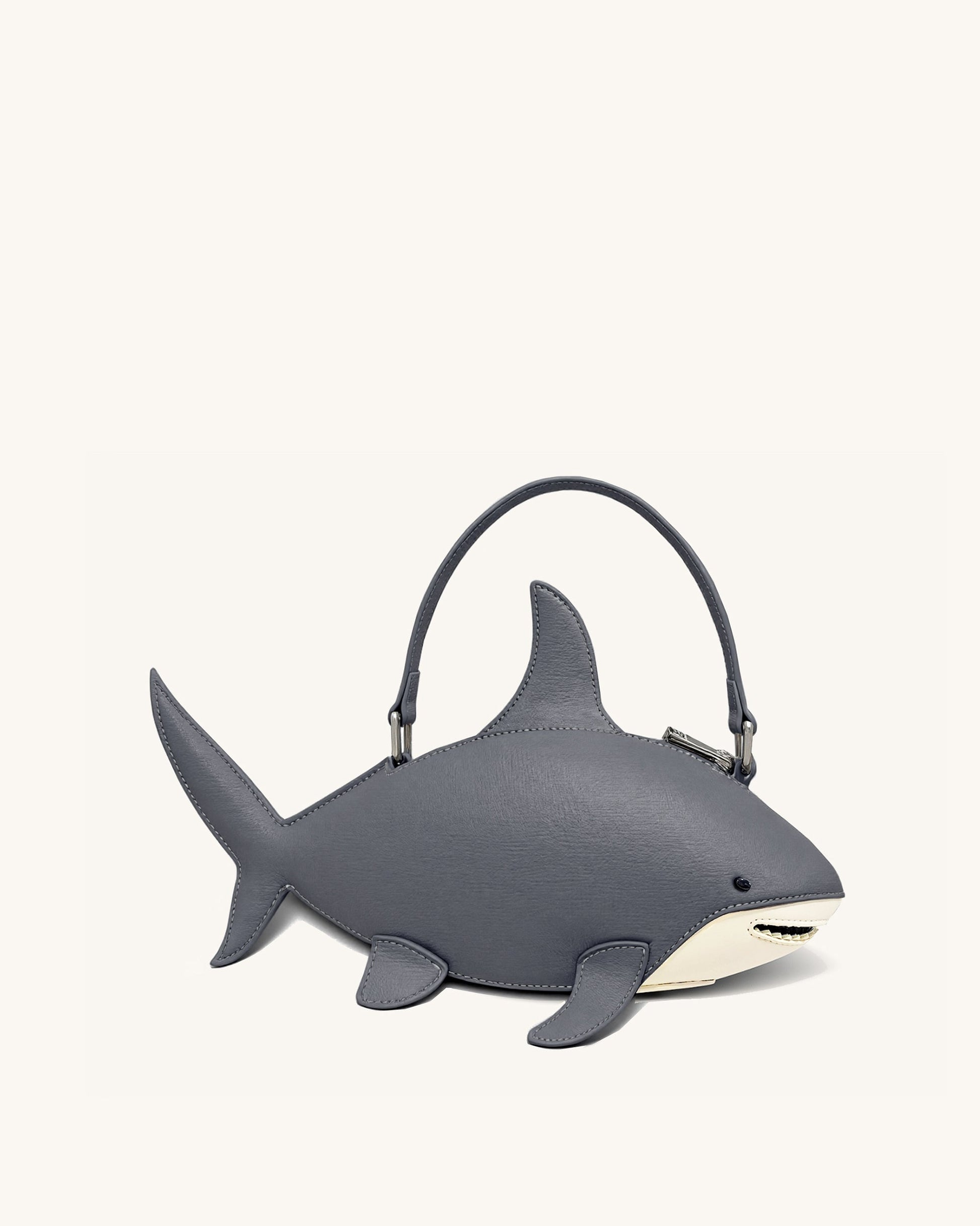 ユニークで遊び心のあるグレーのサメ型ハンドバッグ。テクスチャードヴィーガンレザー製で、シルバーの金具を使用しています。コンパクトなサイズで必要なものが収納でき、個性的で楽しいデザインが特徴です。