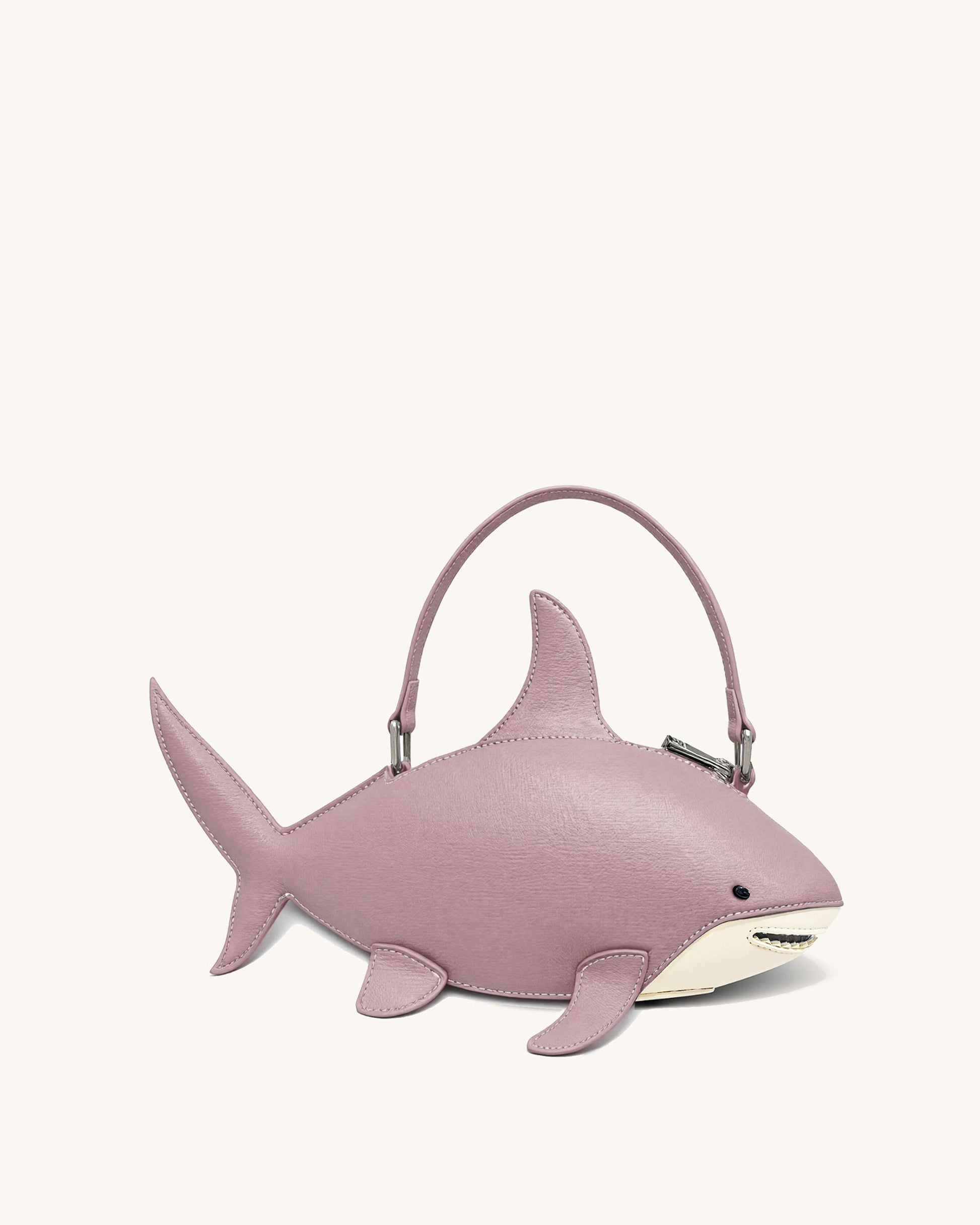 サメをイメージした遊び心のあるミニバッグ。柔らかく丈夫なヴィーガンレザー製。シルバーの金具が洗練されたアクセントを加えます。個性的なスタイリングや小物の収納に最適です。