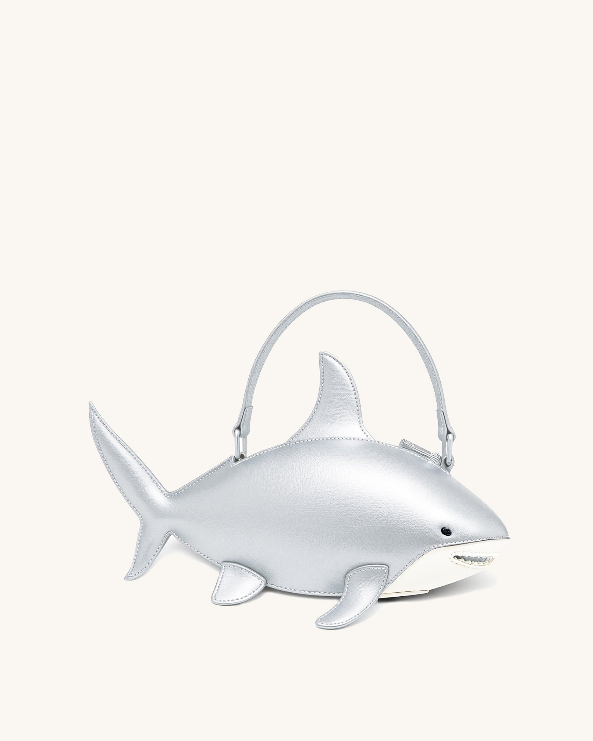 メタリックシルバーのユニークなサメ型ハンドバッグ。遊び心があり目を引くデザインで、構造的なシルエットが特徴です。どんなコーディネートにも楽しさをプラスします。