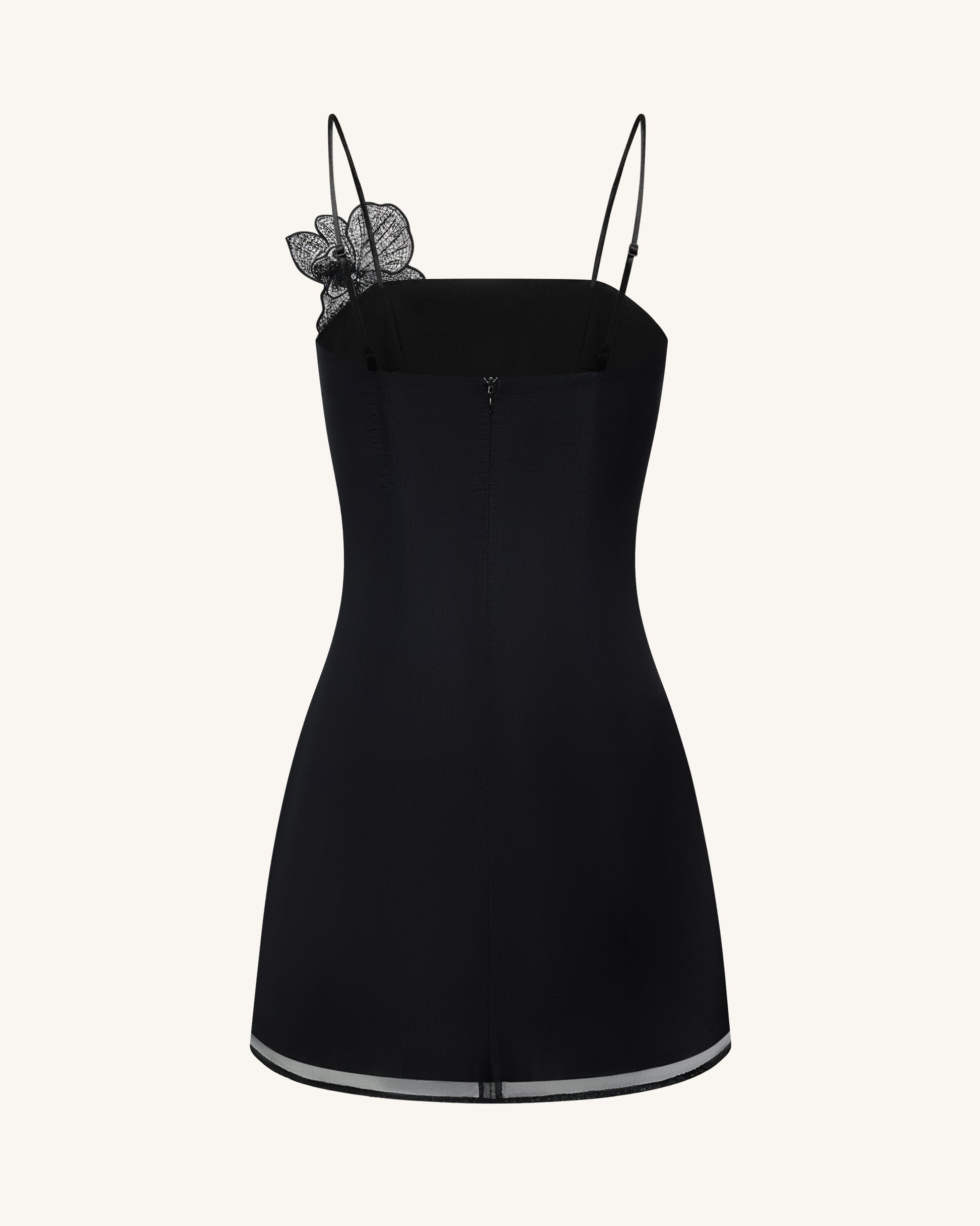 細いスパゲッティストラップを備えたブラックのミニドレス。ネックラインから裾にかけて、大ぶりで精巧に刺繍されたフラワーアップリケがあしらわれています。大胆なフラワーデザインが、洗練されたエレガントなシルエットに存在感を添え、イブニングイベントや特別なシーンに最適です。