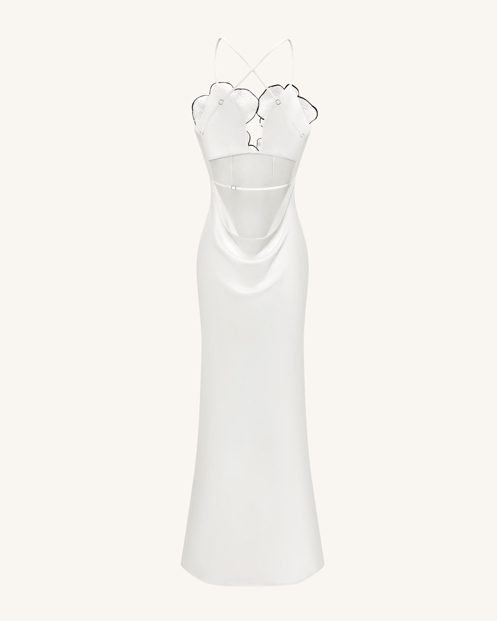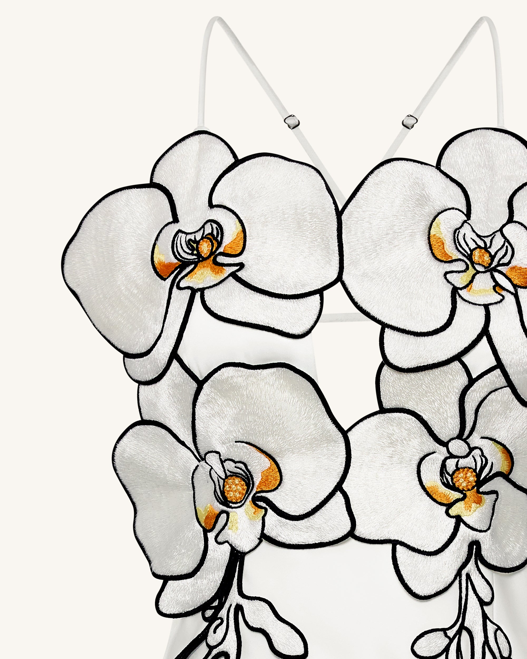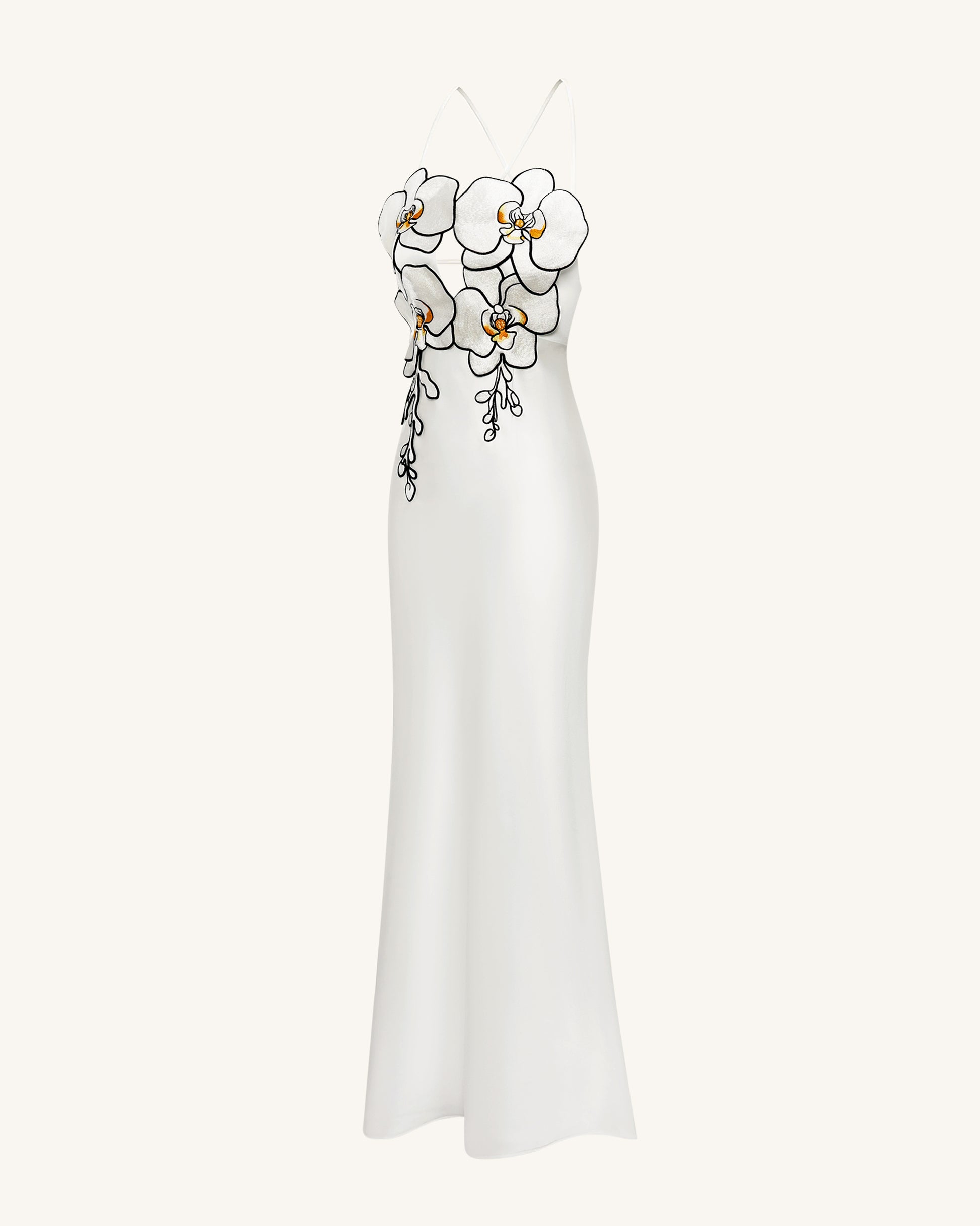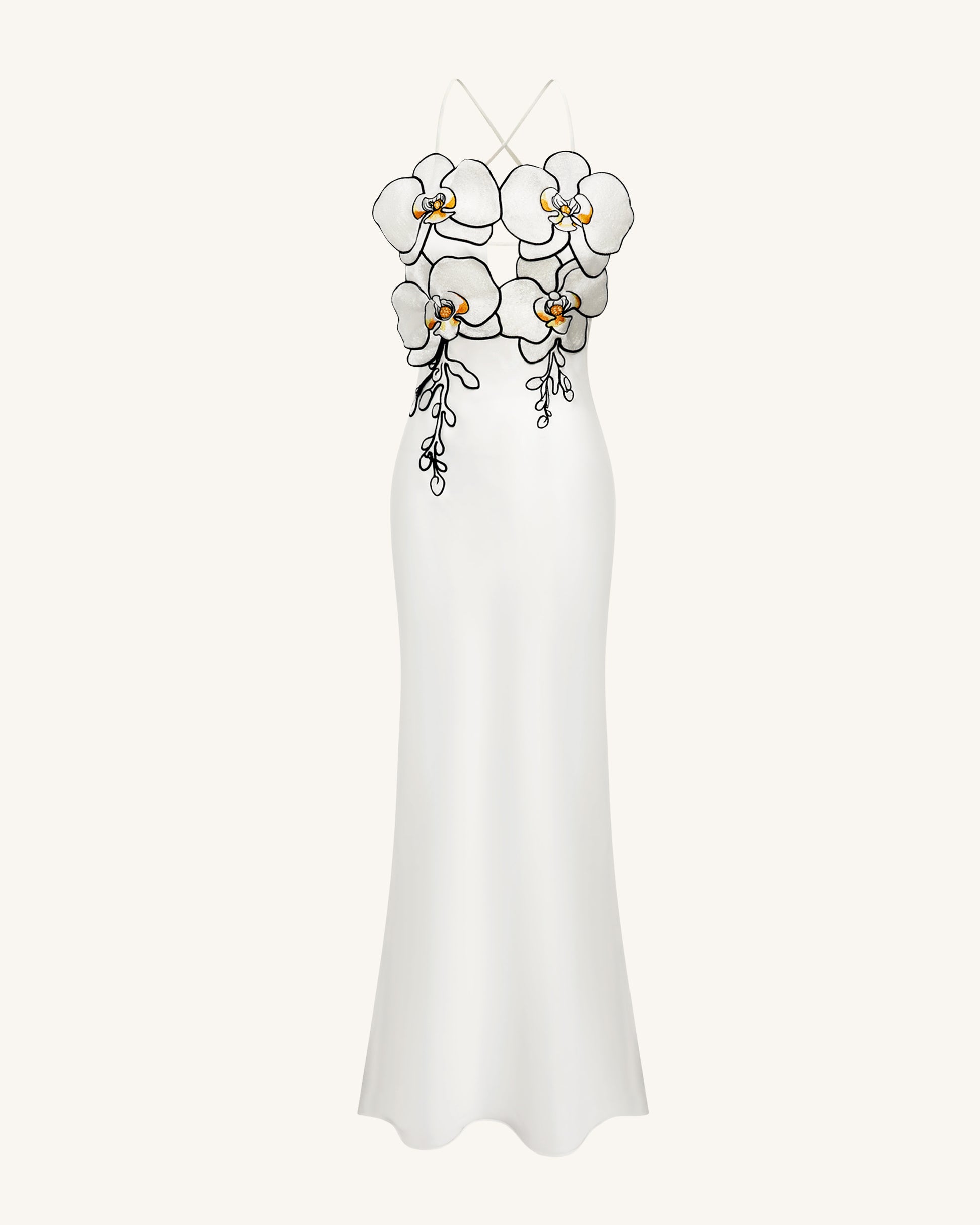 大胆なラン型の刺繍が胸元を飾る、立体感あふれるフラワーモチーフが印象的なホワイトのイブニングドレス。ボディラインを美しく引き立てるタイトなシルエットとサイドスリットがエレガントな雰囲気を演出。背中はクロスストラップ付きのオープンデザインで、センシュアルな魅力をプラス。フォーマルイベントやレッドカーペット、モードなシーンにもふさわしい一着です。