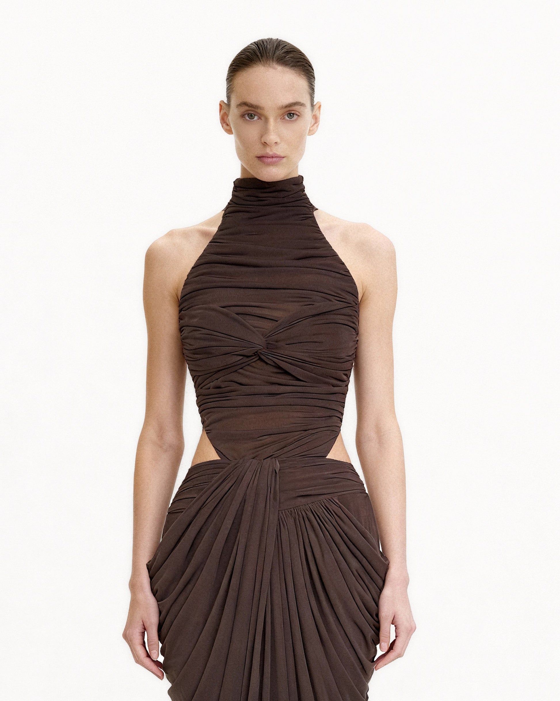ルーシュ ツイストフロント ホルター ボディスーツ - ブラウン