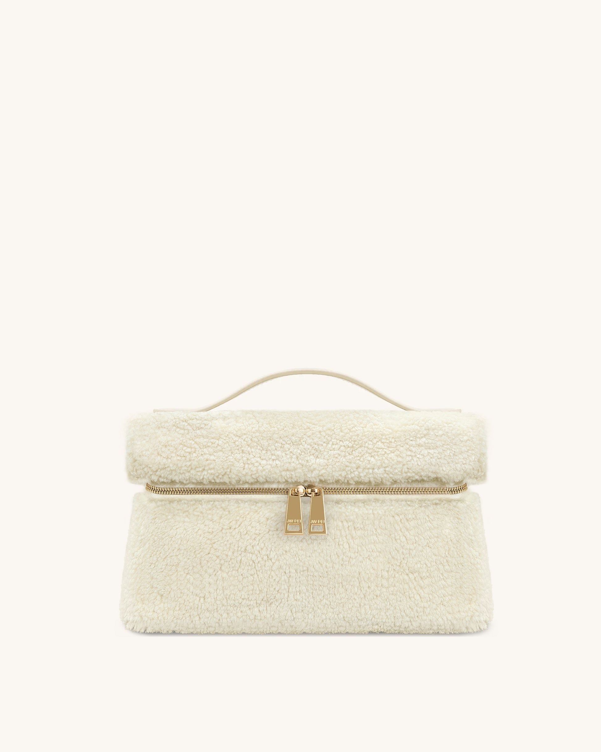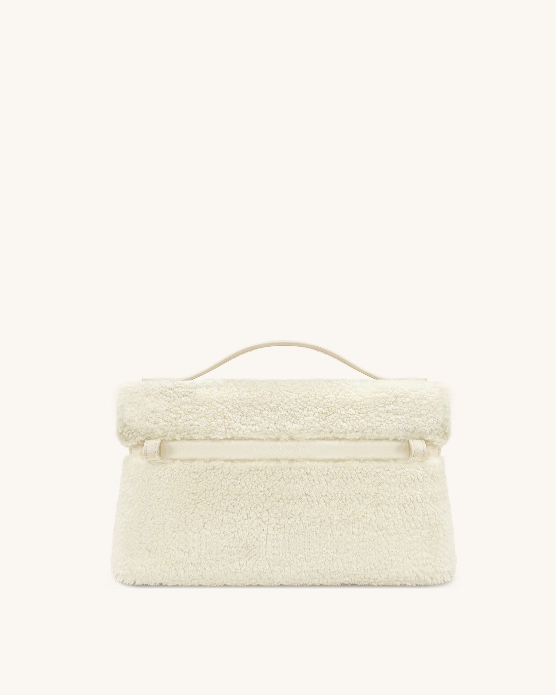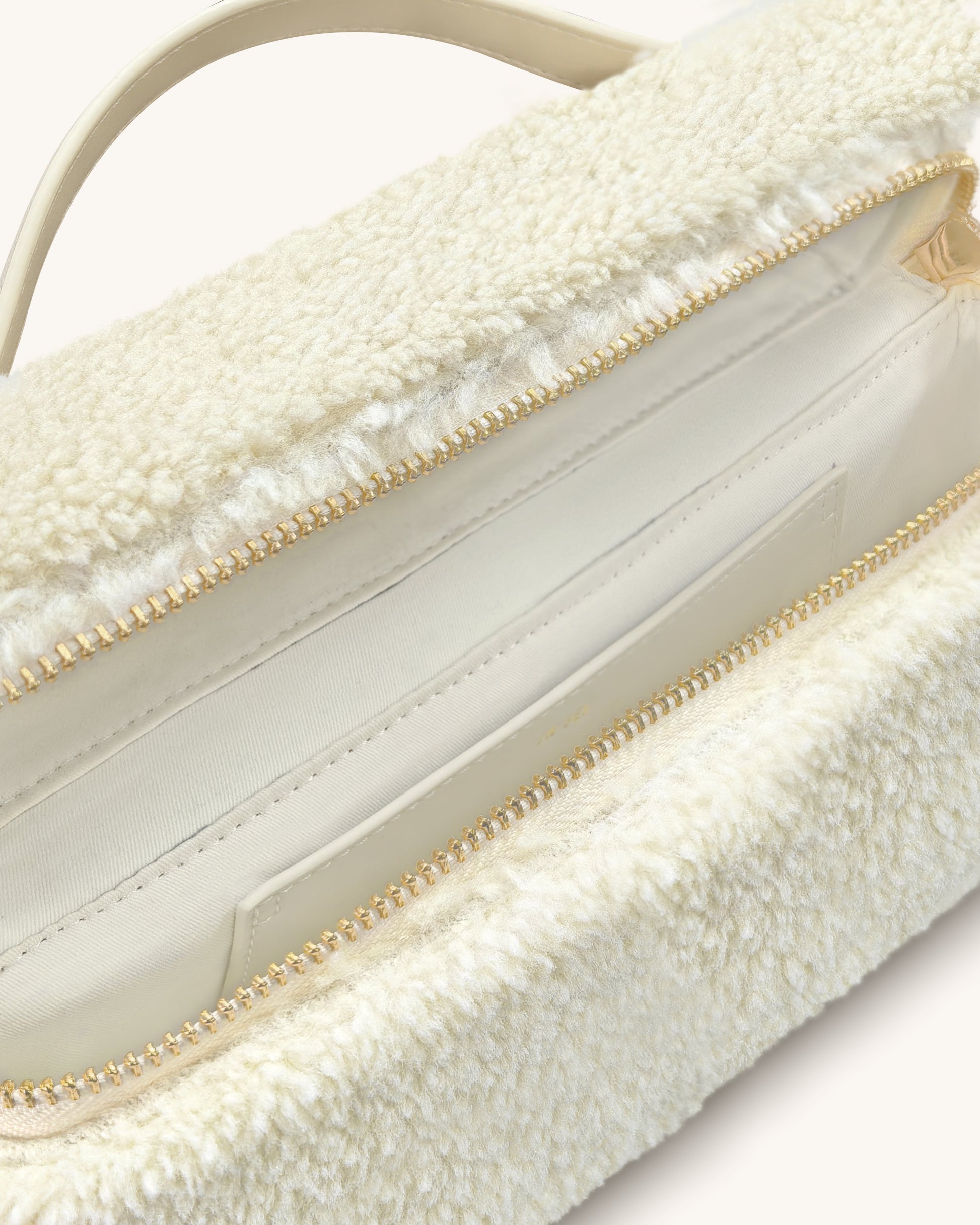 暖かみがありながら構造的でモダンなデザイン。柔らかなフェイクファー素材にゴールドの金具がアクセント。長さ調節・取り外し可能なシングルショルダーストラップ付きです。