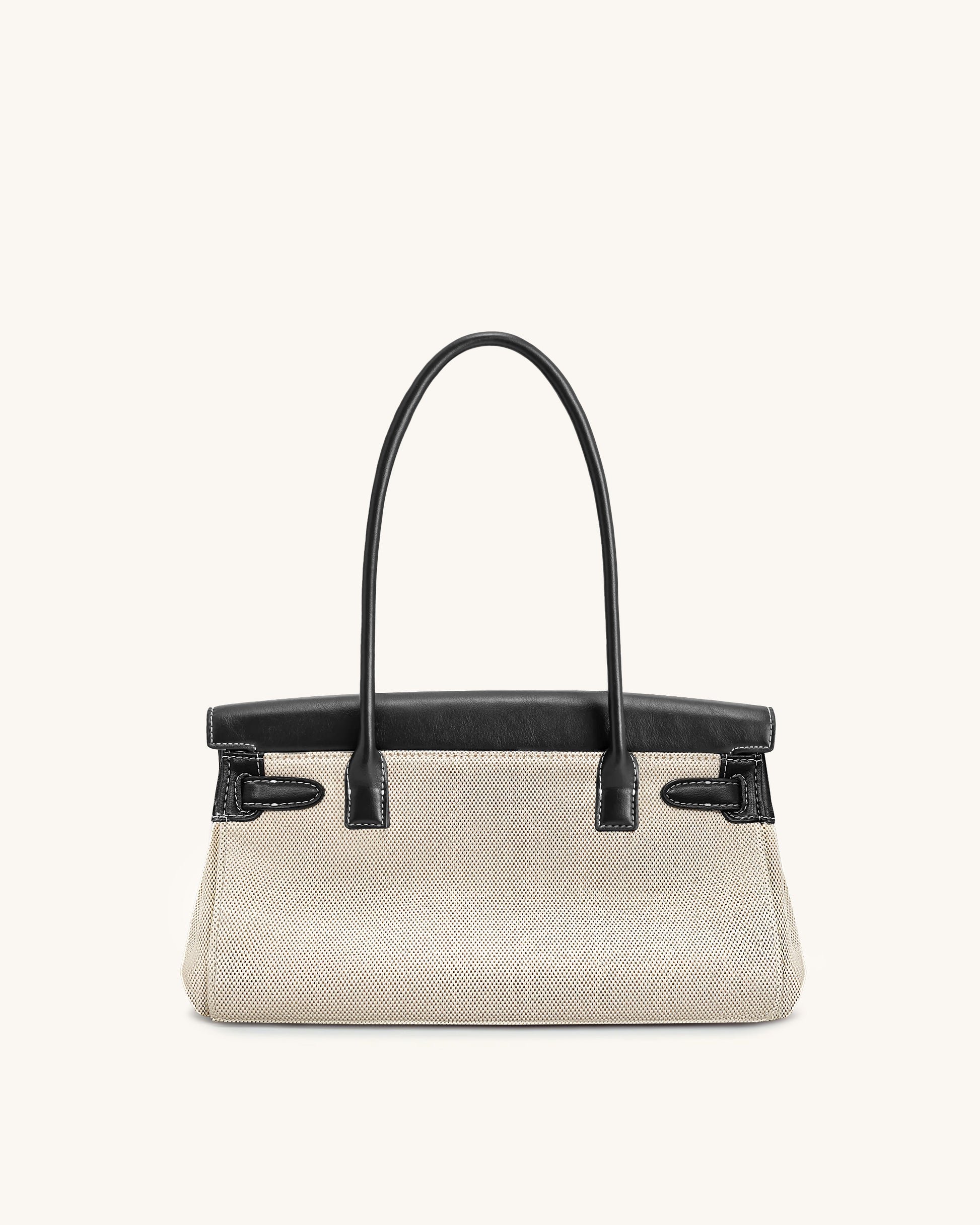 シックで構造的なキャンバスとヴィーガンレザーのトップハンドルバッグ。黒とベージュのコントラストカラーにゴールドの金具がアクセントとなり、タイムレスなスタイルを演出します。日常の必需品が十分収納でき、ツイストロックでしっかりと閉じられます。