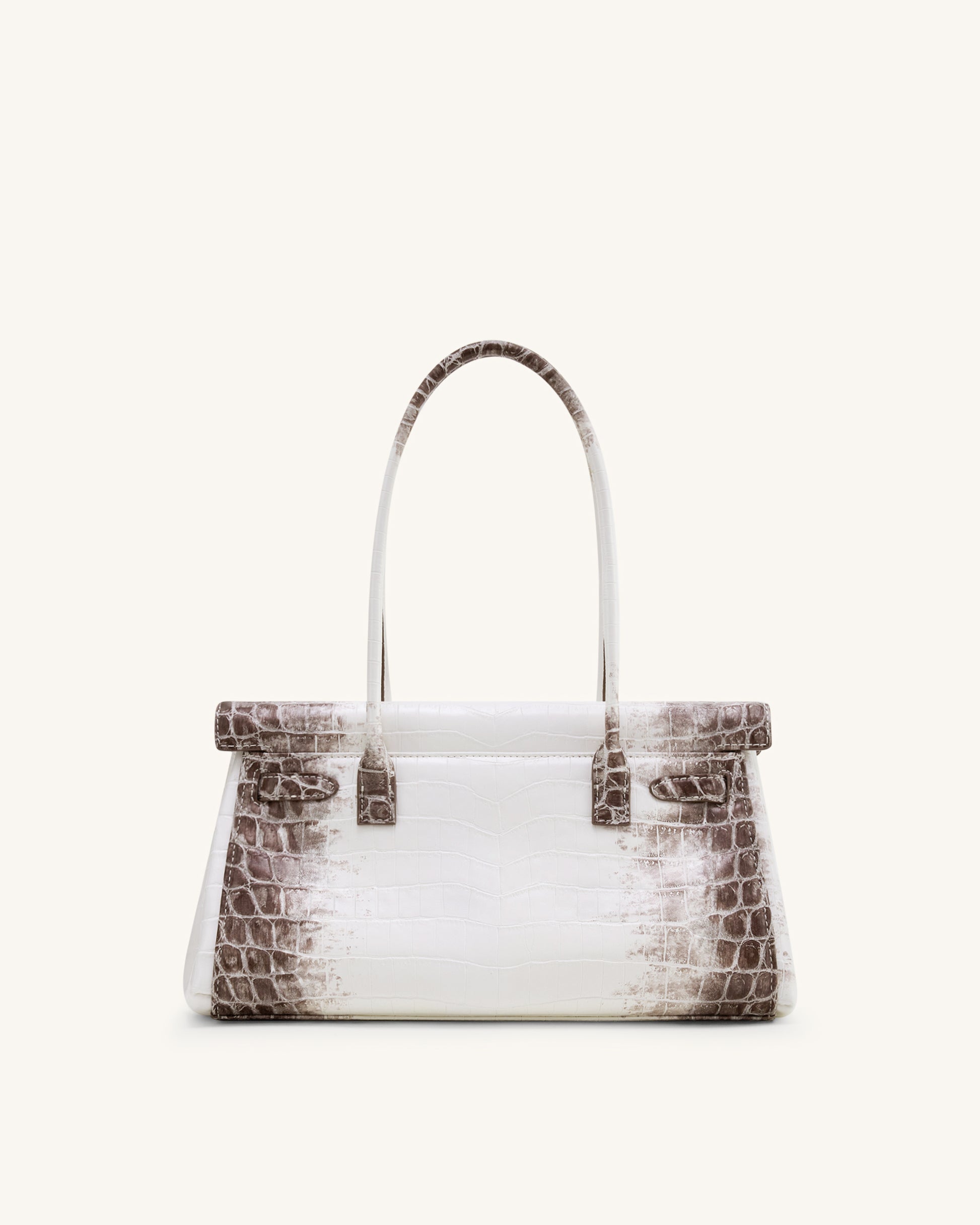 エレガントなトップハンドルバッグで、豪華なクロコ型押しのヴィーガンレザー仕上げが特徴です。ゴールドの金具が洗練された雰囲気をプラスします。日常の必需品が十分収納できるスペースがあります。